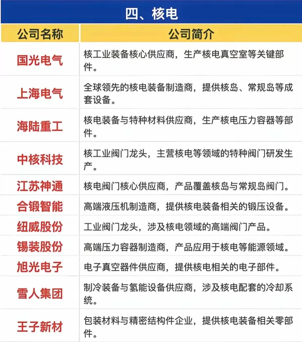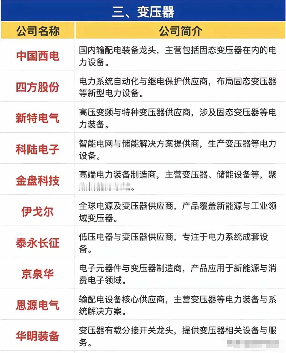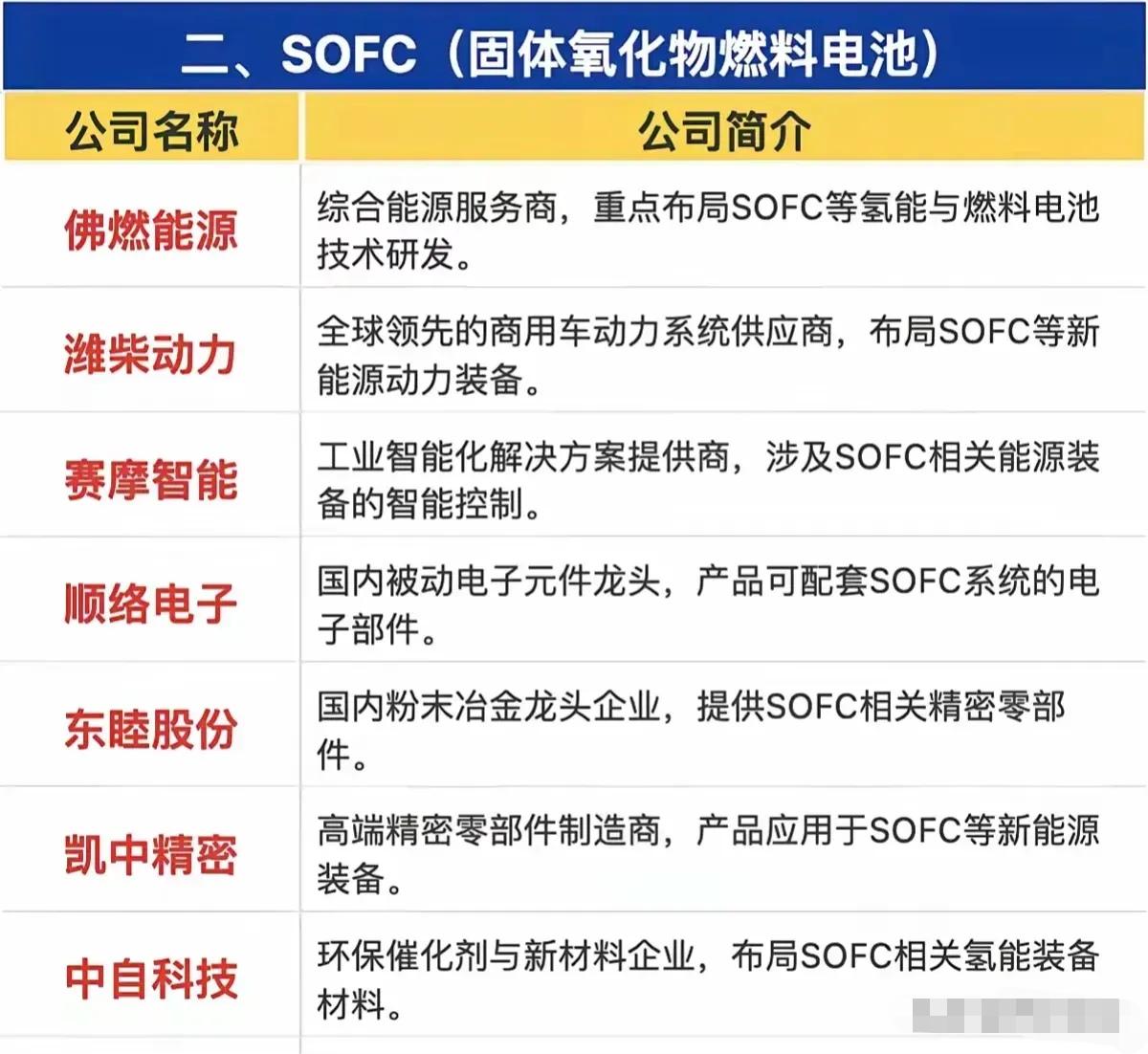 近期受外媒报道英伟达将举办数据中心电力短缺问题峰会这一事件驱动(该峰会反映能源短缺对配备其高能耗AI服务器芯片的设施建设企业产生影响),相关内容围绕四类能源及电力相关领域展开,介绍了各领域的代表性公司及业务方向: 一、燃气轮机领域:涉及7家公司,包括全球最大能源装备制造集团之一的东方电气(主营燃气轮机等六电装备);全球领先的工业级绿色智能系统服务商上海电气(涵盖燃气轮机等能源与工业装备);高端装备核心零部件供应商应流股份(聚焦燃气轮机等能源装备关键部件研发生产);全球最大轮胎模具制造商之一的豪迈科技(同时生产燃气轮机缸体等精密机械零部件);A股唯一北美燃气轮机整机厂商杰瑞股份(主营油气装备与燃气轮机);具备高温合金全流程研制能力的民企万泽股份(产品应用于燃气轮机等装备);国内高端高温合金核心供应商钢研高纳(产品用于燃气轮机等航空航天与能源装备)。 二、SOFC(固体氧化物燃料电池)领域:涉及7家公司,包括综合能源服务商佛燃能源(重点布局SOFC等氢能与燃料电池技术研发);全球领先的商用车动力系统供应商潍柴动力(布局SOFC等新能源动力装备);工业智能化解决方案提供商赛摩智能(涉及SOFC相关能源装备的智能控制);国内被动电子元件龙头顺络电子(产品可配套SOFC系统的电子部件);国内粉末冶金龙头企业东睦股份(提供SOFC相关精密零部件);高端精密零部件制造商凯中精密(产品应用于SOFC等新能源装备);环保催化剂与新材料企业中自科技(布局SOFC相关氢能装备材料)。 三、变压器领域:涉及10家公司,包括国内输配电装备龙头中国西电(主营包括固态变压器在内的电力设备);电力系统自动化与继电保护供应商四方股份(布局固态变压器等新型电力设备);高压变频与特种变压器供应商新特电气(涉及固态变压器等电力装备);智能电网与储能解决方案提供商科陆电子(生产变压器等电力设备);高端电力装备制造商金盘科技(主营变压器、储能设备等,聚焦新能源领域);全球电源及变压器供应商伊戈尔(产品覆盖新能源与工业领域变压器);低压电器与变压器供应商泰永长征(专注于电力系统成套设备);电子元器件与变压器制造商京泉华(产品应用于新能源与消费电子领域);输配电设备核心供应商思源电气(主营变压器等电力装备与系统解决方案);变压器有载分接开关龙头华明装备(提供变压器相关设备与服务)。 四、核电领域:涉及11家公司,包括核工业装备核心供应商国光电气(生产核电真空室等关键部件);全球领先的核电装备制造商上海电气(提供核岛、常规岛等成套设备);核电装备与特种材料供应商海陆重工(生产核电压力容器等部件);核工业阀门龙头中核科技(主营核电等领域的特种阀门研发生产);核电阀门核心供应商江苏神通(产品覆盖核岛与常规岛阀门);高端液压机制造商合锻智能(提供核电装备相关的锻压设备);工业阀门龙头纽威股份(涉及核电领域的高端阀门产品);高端压力容器制造商锡装股份(产品应用于核电等能源领域);电子真空器件供应商旭光电子(提供核电相关的电子部件);制冷装备与氢能设备供应商雪人集团(涉及核电配套的冷却系统);包装材料与精密结构件企业王子新材(提供核电装备相关零部件)。