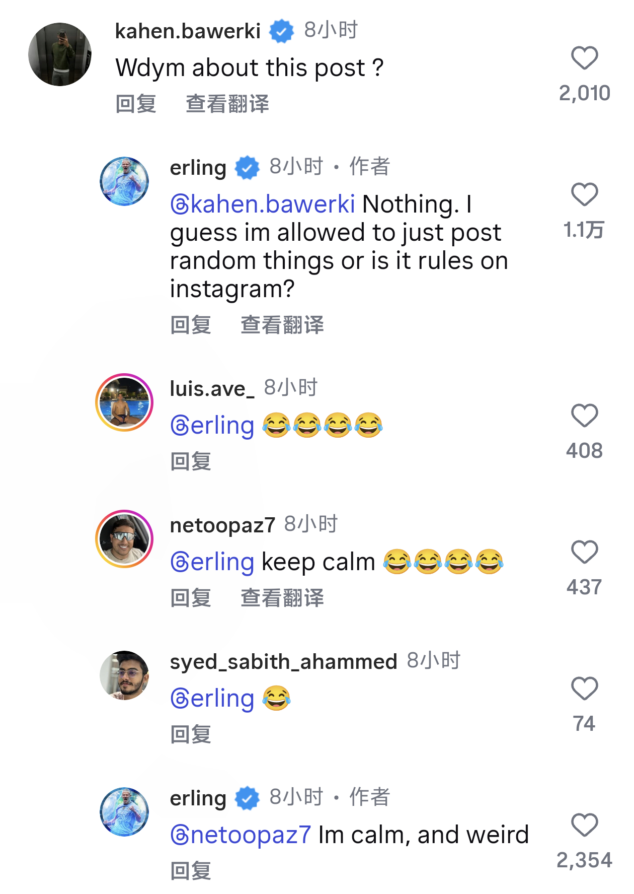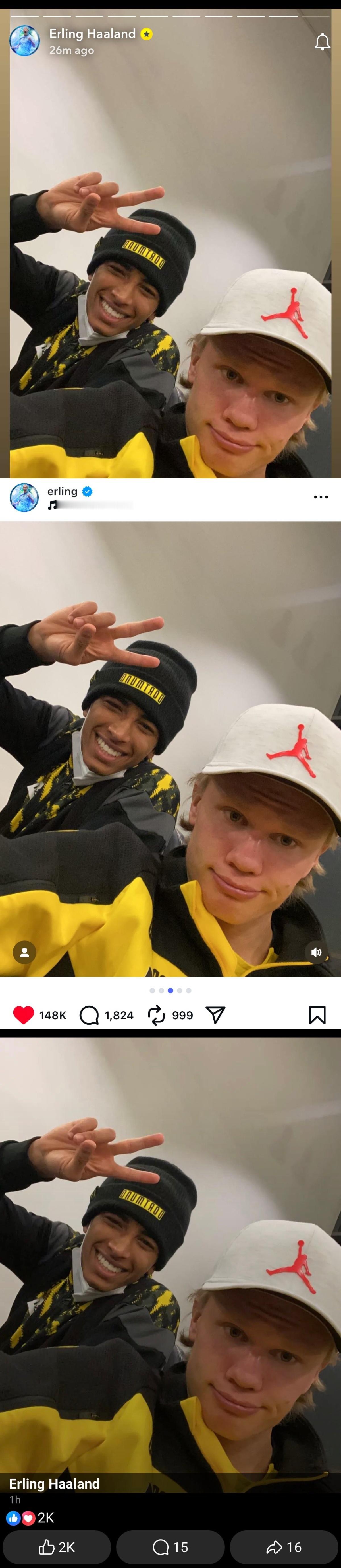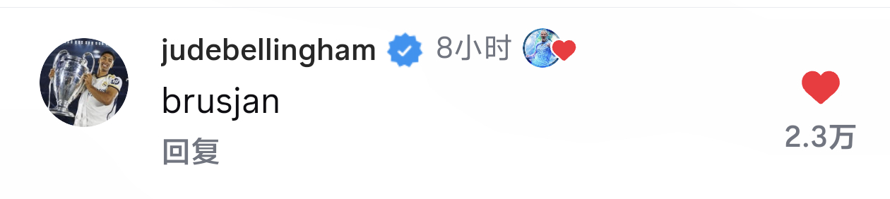 哈兰德昨晚在IG、X、snap、facebook四个平台发了和朱贝曾经和现在的合影贝林在IG评论“兄弟”,哈兰德点赞👍有网友问发这些什么意思?哈兰德说,我猜我应该被允许在IG随便发点什么,还是说IG有规定?皇马vs曼城