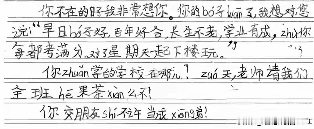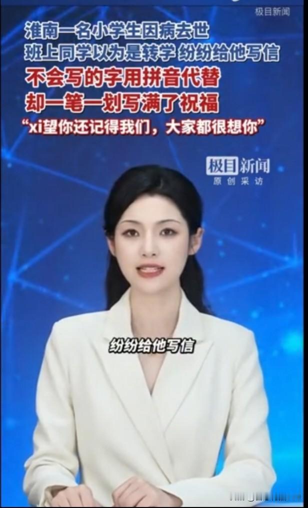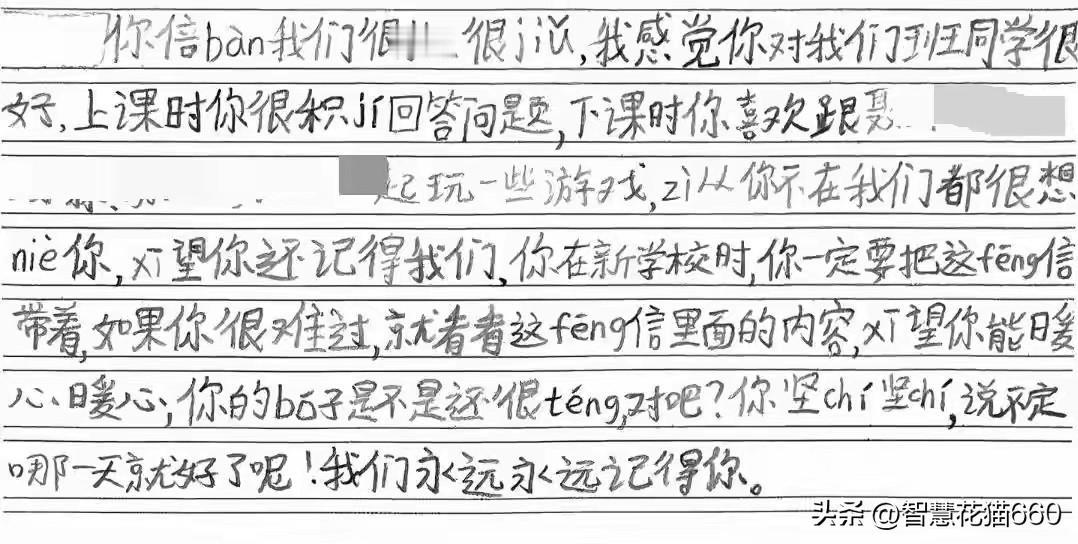 令人心痛!安徽淮安,一小学三年级的学生因病去世,班主任非常的痛心。为了让全班同学和这位不幸去世的同学告别,老师选择了隐藏真相,而是告诉同学们,这名同学转学了,让小朋友们给这名同学写一封信,其实这也算是一种告别吧。 其中一位同学这样写道:你不在的日子我非常想你,你的bo子wan了, 想对你说:“早日bo子好,百年好合,长生不老,学业有成,zhu你每都考满分,对了星期天一起下楼玩。” 你zhuan学的学校在哪?zuo天,老师请我们全班he果茶xian么不!你交朋友shi不许当成xiang弟! 从这位小朋友的字里行间,可以想到他们两个应该住在同一个小区,每逢星期六、星期天都会约好一起下楼玩。而小朋友的第一句话就表达了对同学的想念,令人动容。 看到这样的消息心里特别的难过,愿天堂没有病痛。