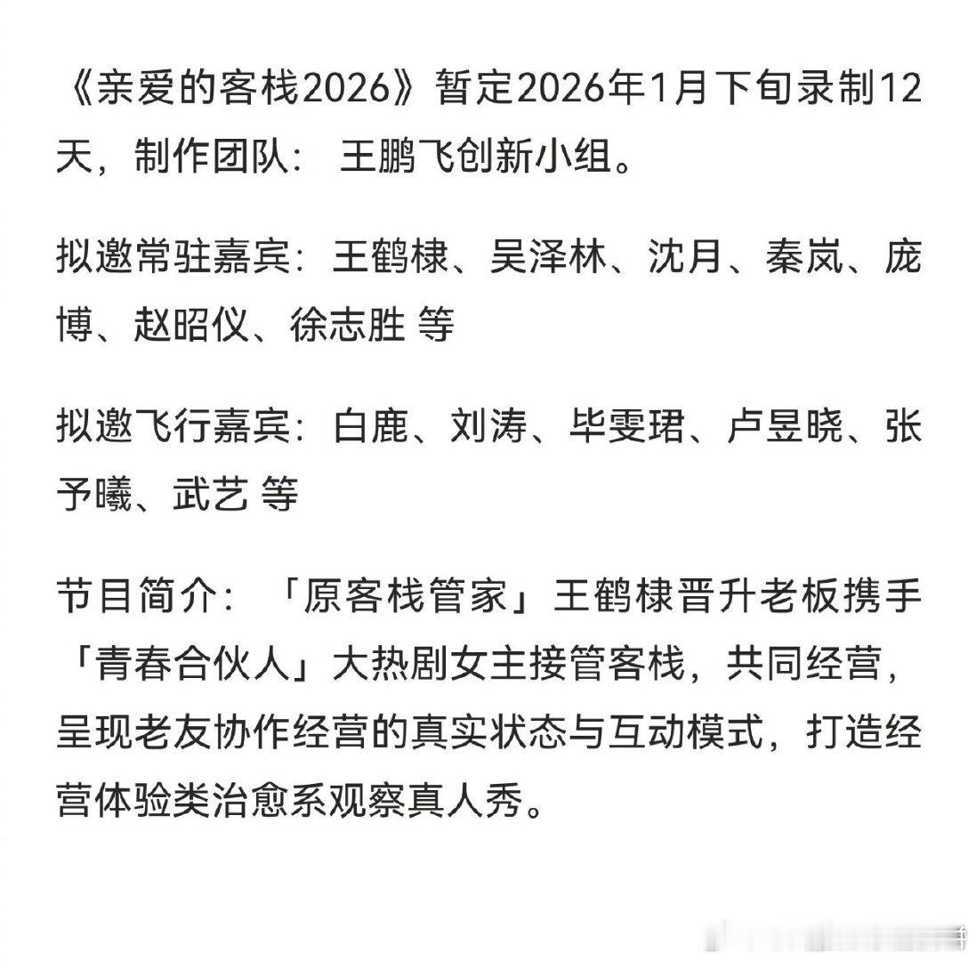 🍉 湖南卫视综艺《亲爱的客栈2026》1月底录制常驻嘉宾:王鹤棣、沈月、秦岚、吴泽林等飞行嘉宾:白鹿、刘涛、毕雯珺、卢昱晓、张予曦等