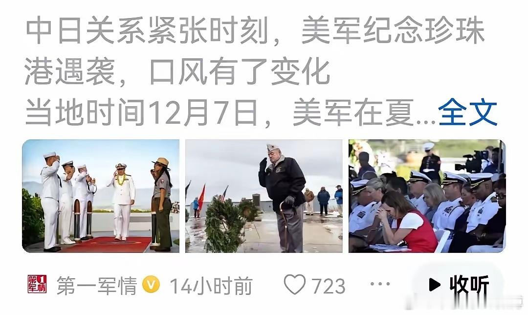 美国高调纪念珍珠港事件,分别向世界和日本传达了什么?高市早苗上台,日本向右急转,军国主义露头明显,世界上很多国家纷纷表示愤慨和担心,也引起了美国高度警惕。美国高调纪念珍珠港事件,一方面是向世界展示不忘历史,坚决捍卫二战成果的姿态;另一方面也是明告日本,美国利用日本反华可以,但日本妄想利用美国复活军国主义连门都没有。日本子摆不正自己的位置,偷鸡不成,蚀把米,必将沦为一个可怜的笑话!热点观点华俊竹有话说