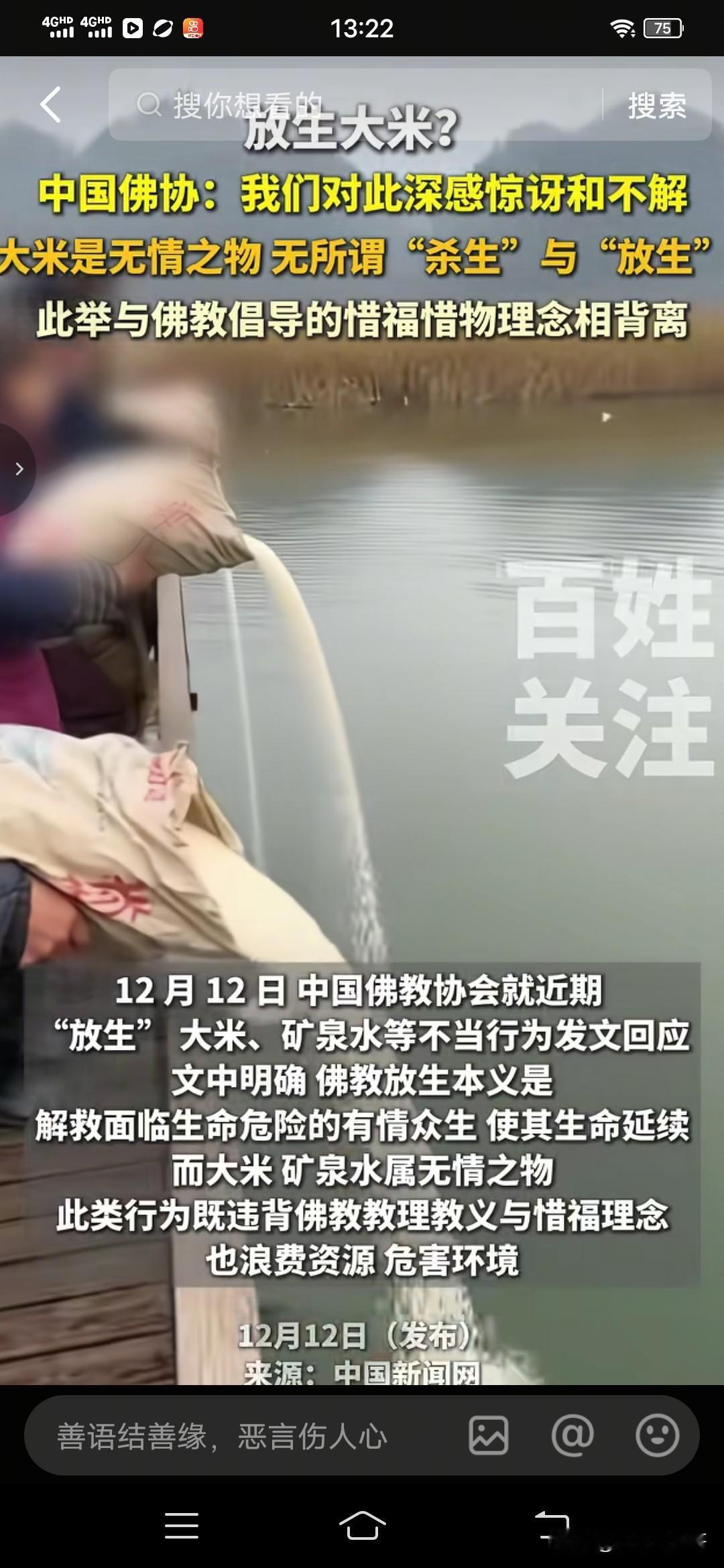 海中大米放生行为连中国佛教协会都看不下去了 ! 12月9日有媒体报道在辽宁丹东的某海湾有人一边跪拜一边将成袋成袋的大米往海中倾倒。 路人觉得这样做简直是浪费粮食 ,于是报警 。 帽子叔叔回复说, 看样子是还愿, 这种行为不构成违法,但涉及粮食浪费不予鼓励。 “还愿”两字让人觉得这些人是信佛教徒。 信佛的人难道不懂得珍惜粮食吗 ? 近几年爆出向水中放生的荒唐事除了放生大米还有人往水中放生矿泉水 ,甚至还有人在小区里面放生蟑螂等等。 12月12日,中国佛教协会发文称对有人向大海中放生大米这种行为深感不解, 对大米和矿泉水来说无所谓杀生与放生, 这不仅违背勤俭节约的传统美德,更是折损福报的行为 。 看来这些人信的可能不是佛教 。 水中放生大米不仅仅是浪费了粮食,这是向社会传递扭曲的价值观。 要杜绝这种荒唐现象,唯一的手段就是对这种不合常理的行为进行惩罚 ,“扰乱公共秩序”或 “寻衅滋事”都够得上 , 如果只对这种行为进行不痛不痒教育的批评,根本解决不了问题。