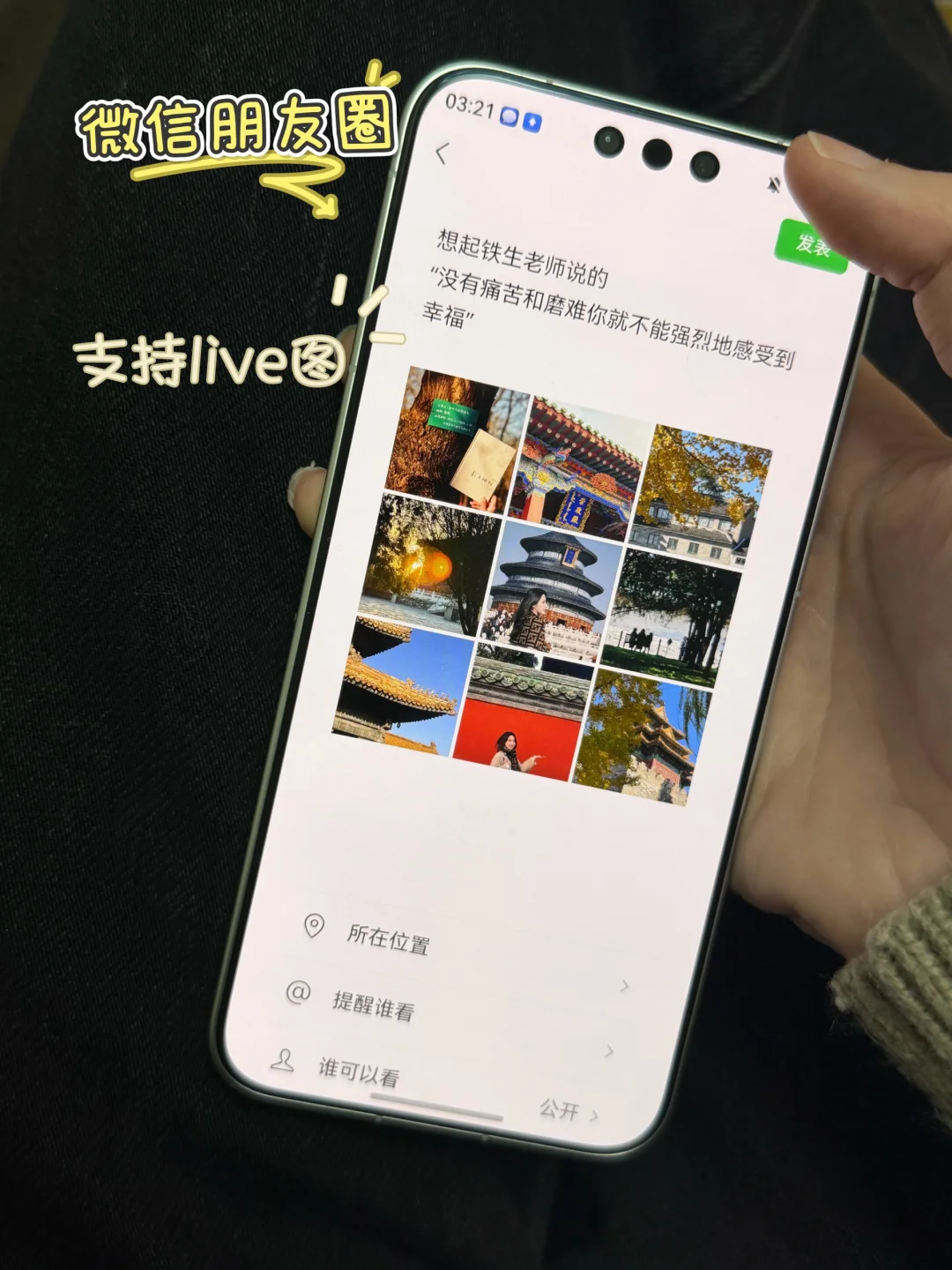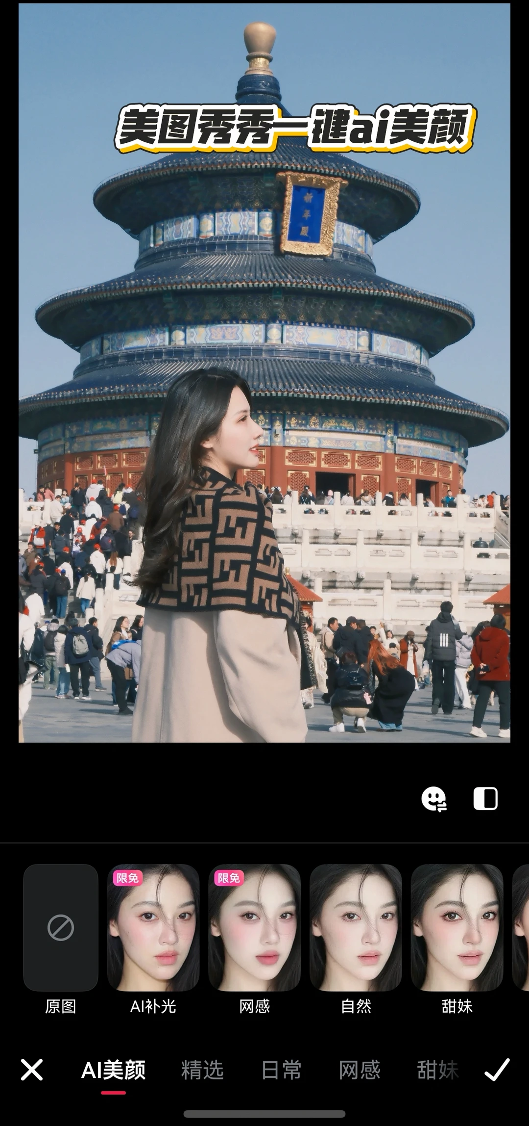 · 出片机位:祈年殿西侧台阶、皇穹宇红墙窗棂、圜丘中心天心石。用鸿蒙6的AI辅助构图,还能自动分析画面拍大片!再把照片导入美图秀秀一键出片