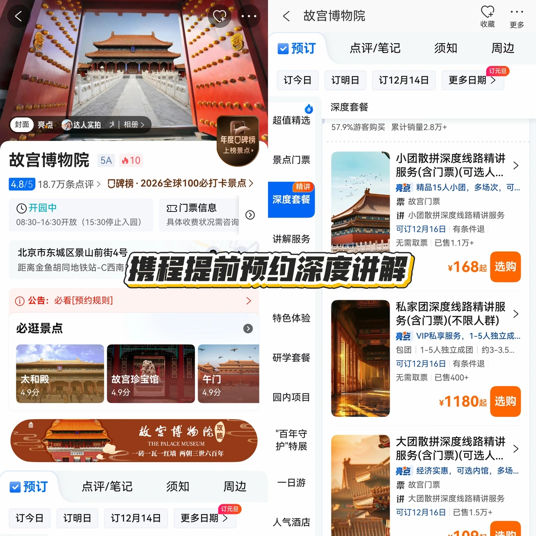 · 门票:60元,提前抢票!在携程可以提前预定讲解服务,揭开紫禁城文化秘辛