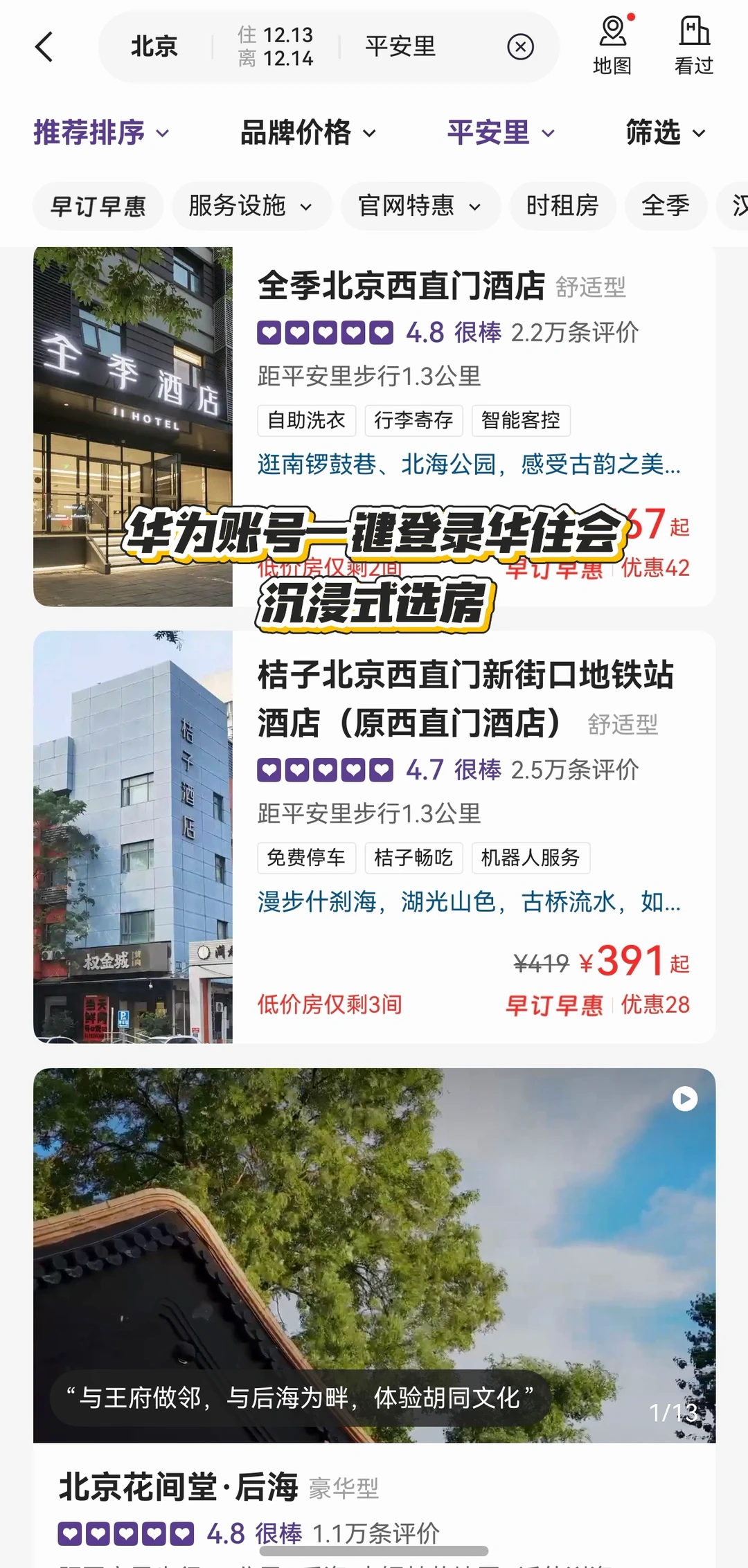 酒店:推荐住平安里地铁站附近,我一般都选华住会酒店。现在用华为Mate 80登录华住会超便捷,沉浸式选房体验和智能酒店导航,实现从选房到入住的顺畅衔接。
