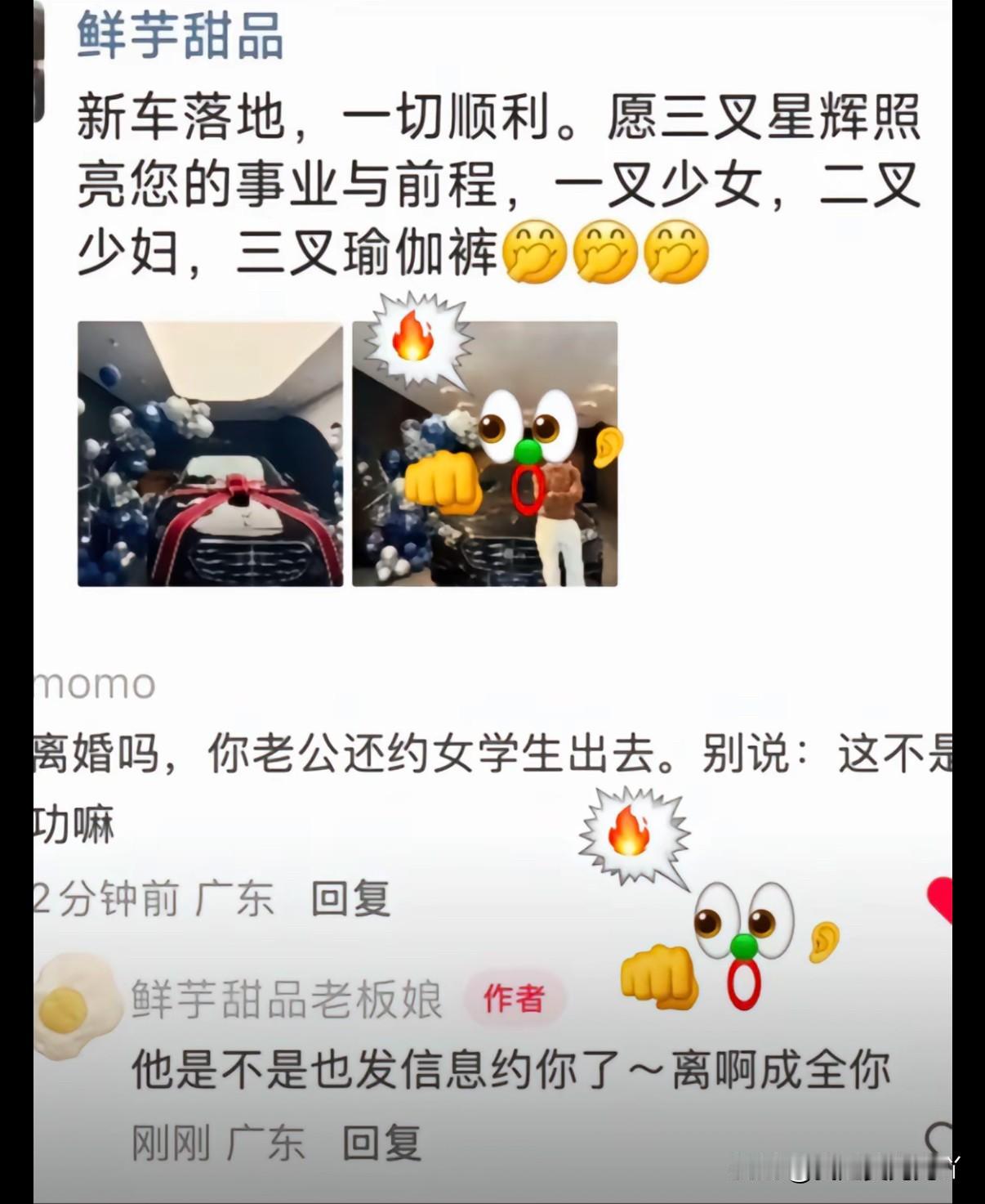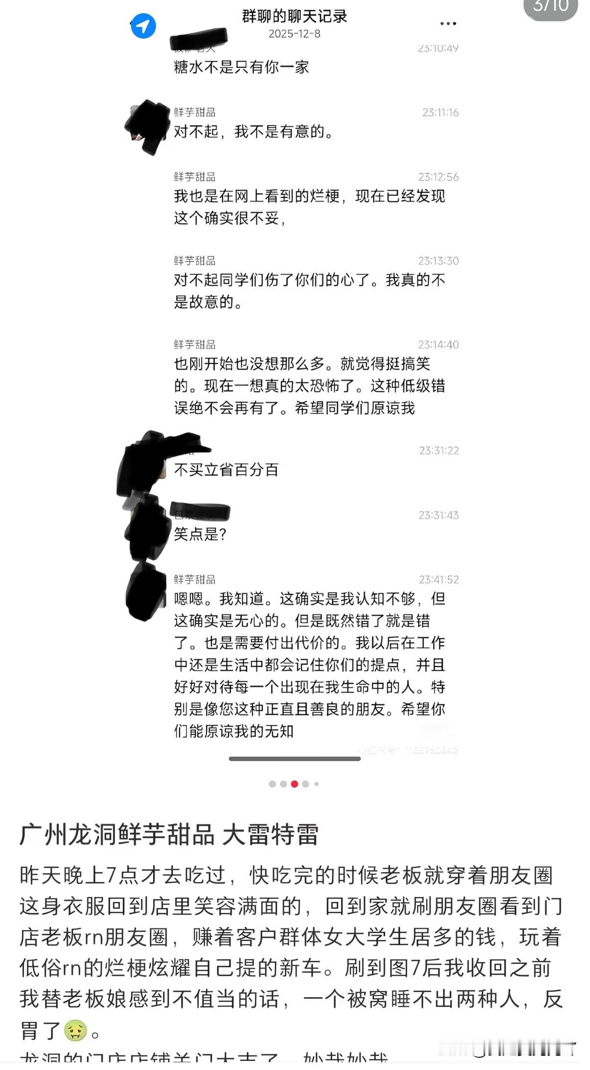广东一糖水店老板发财提豪车发朋友圈炫耀:一叉少女二叉少妇三叉瑜伽裤,朋友圈是早上发的糖水店是晚上关门倒闭的 见事态严重让老婆出面道歉,因糖水店位于几所大学城内糖水这种小吃经常去光顾的都是附近女生,老板在此经营多年靠味道以及学生之间的口口相传积累下不少顾客,店里经常是爆满状态,有学生反映老板还有约女学生出去玩的行为老板娘得知后反而出言维护:他也约你了吗?离婚成全你? 赚着女生的钱转头侮辱女性,当晚店铺就关门歇业门上也贴出转让公告不到一天时间搬空整间商铺。当地派出所工作人员称已经批评教育老板已认识到了错误不应该玩梗 病从口入 祸从口出,一朝得志语无伦次