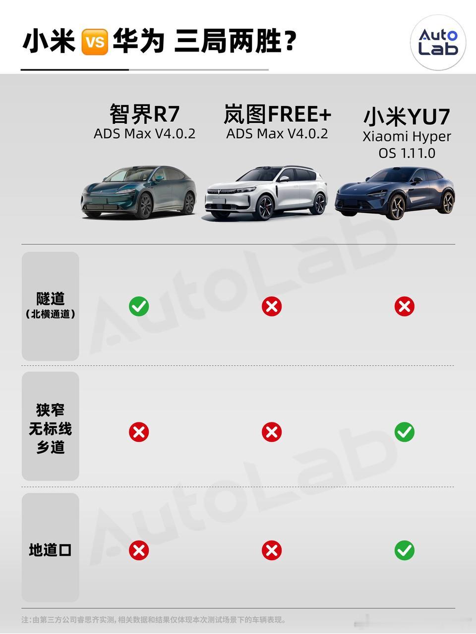 三局两胜,小米辅助驾驶赶上华为了?来看看小米YU7以及搭载华为乾崑ADS 4的智界R7、岚图FREE+在这三大场景中的表现。上海北横通道:·小米YU7未通过,未汇入正确入口·岚图FREE+未通过,未汇入正确入口·智界R7通过狭窄无标线乡道:·岚图FREE+未通过,半途降级·智界R7未通过,下桥洞后没及时右转进入狭窄乡道·小米YU7通过地道口:·智界R7 ,错误驶入地面。 ·岚图FREE+ ,错误驶入地面·小米YU7 ,成功驶入地道。 AutoLab大V聊车