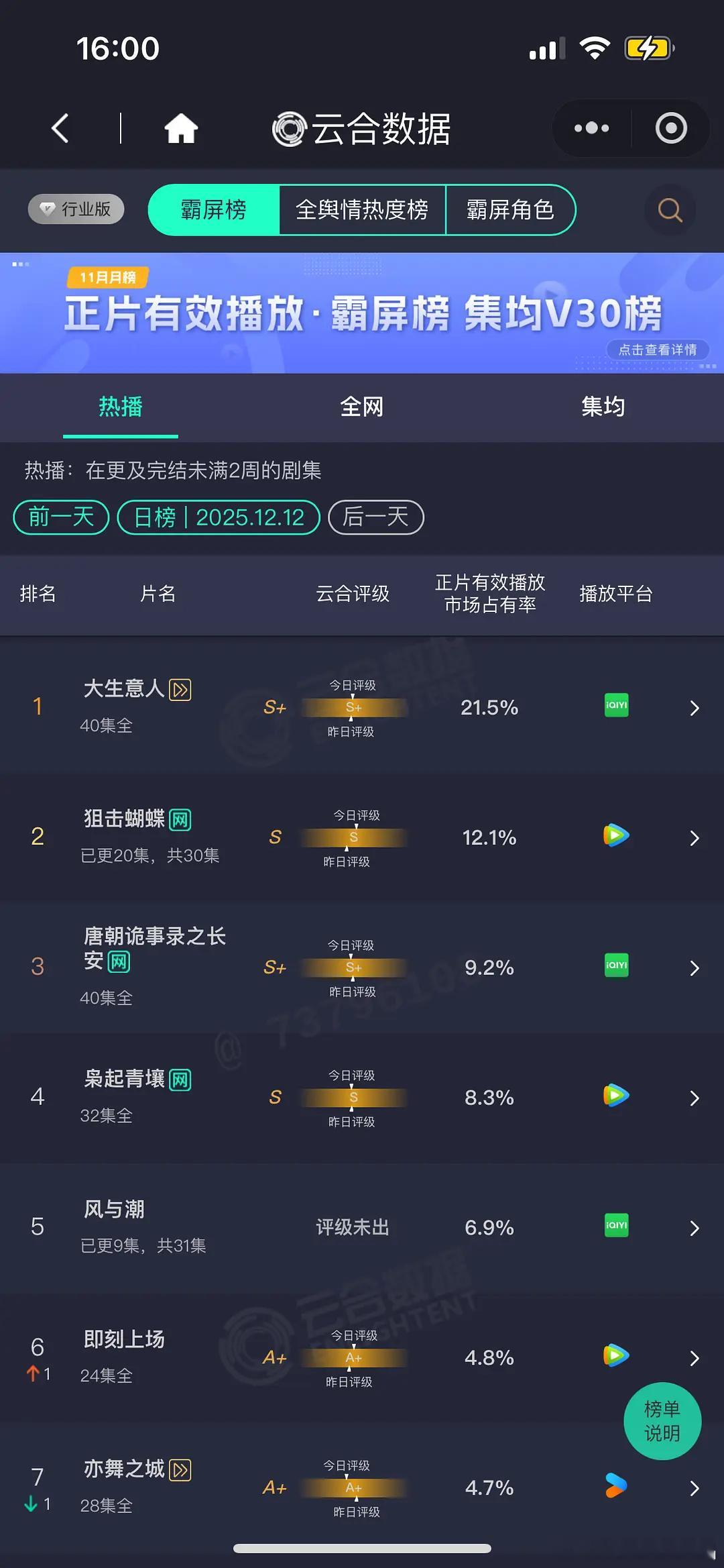 12.12 云合 大生意人21.5% 狙击蝴蝶12.1% 风与潮6.9%长安4.5% 双轨3.5%