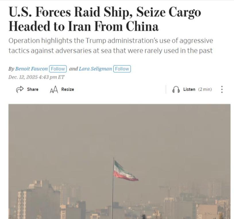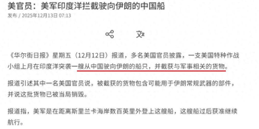 好家伙,美国这回可真成“海上强盗”了! 《华尔街日报》自己爆出来:美军特种部队在印度洋直接突袭一艘从中国开往伊朗的商船!登船、搜货、销毁所谓“军用物品”! 美军在印度洋公海拦截运往伊朗的中国货轮并销毁相关货物,此举是美方对伊制裁的升级。我们需时刻保持警惕,运用多元手段,坚决捍卫国家正当利益不受侵犯。 开了这个头以后美国运往以色列,台湾,日本,韩国,菲律宾的我们都可以拦截和扣押。前面有车,后面有辙。有初一就有十五。我们一定向美国学习。 中国这下也可拦截美给台湾军售的任何軍事物资,不管是空运海运都有权力拦截这些危害中国安全的物资,凡带军用货物都可以安全危害进行拦截合理合法哟。 美国战略收缩,但从没有放过中国,而是一门心思的来对付我们,如今中国只有一条路可走,就是做好自己、奋勇向前!