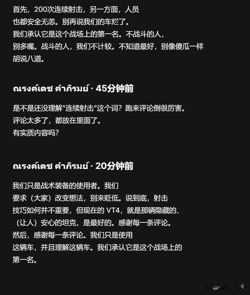 国产最强外贸坦克首次战损,泰柬之战进入焦灼! 根据泰柬战场消息,被网友称为最强外贸坦克的国产VT-4主战坦克首次出现战损,该坦克装备于泰国装甲部队。关于此事目前网络上有两个说法,一是自己炸膛,二是被柬埔寨军大口径火炮集群射击给蒙中了。同时,泰国士兵在网络上也发表评论,该坦克进行了200次射击,可见战事十分胶灼。如果是短时间内连续多次射击导致炸膛,这倒也不意外,谁家的坦克炮来了也不好使。至于说是被大口径火炮集群射击蒙中的说法,从开战到现在泰军无论是装备上,还是战术上都强于柬埔寨,尤其是装甲部队一路突进柬埔寨境内直接打击赌场和电诈园区,大有闪电战之势。柬埔寨的空军被压制不敢起飞,也只能地面炮兵部队进行截击。按照泰国士兵的说法,如果真被大口径火炮击中,坦克内的士兵很难做到安然无恙!所以,我个人觉得在高强度的射击情况下导致炸膛的说法更接近事实吧!