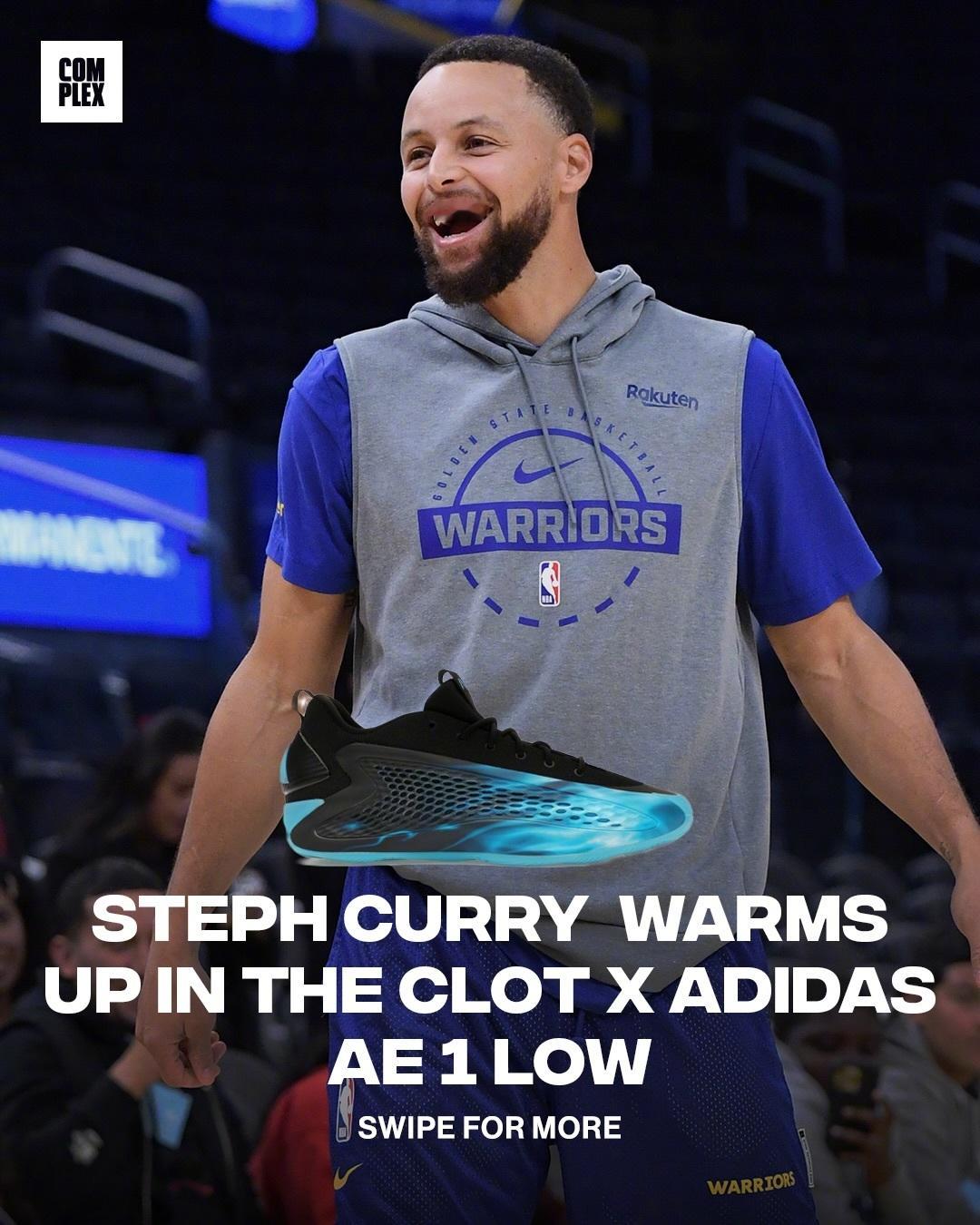 库里今天入场穿着的是加内特的Nike Air Garnett 3,热身时则穿了Clot联名的AE 1 Low。
