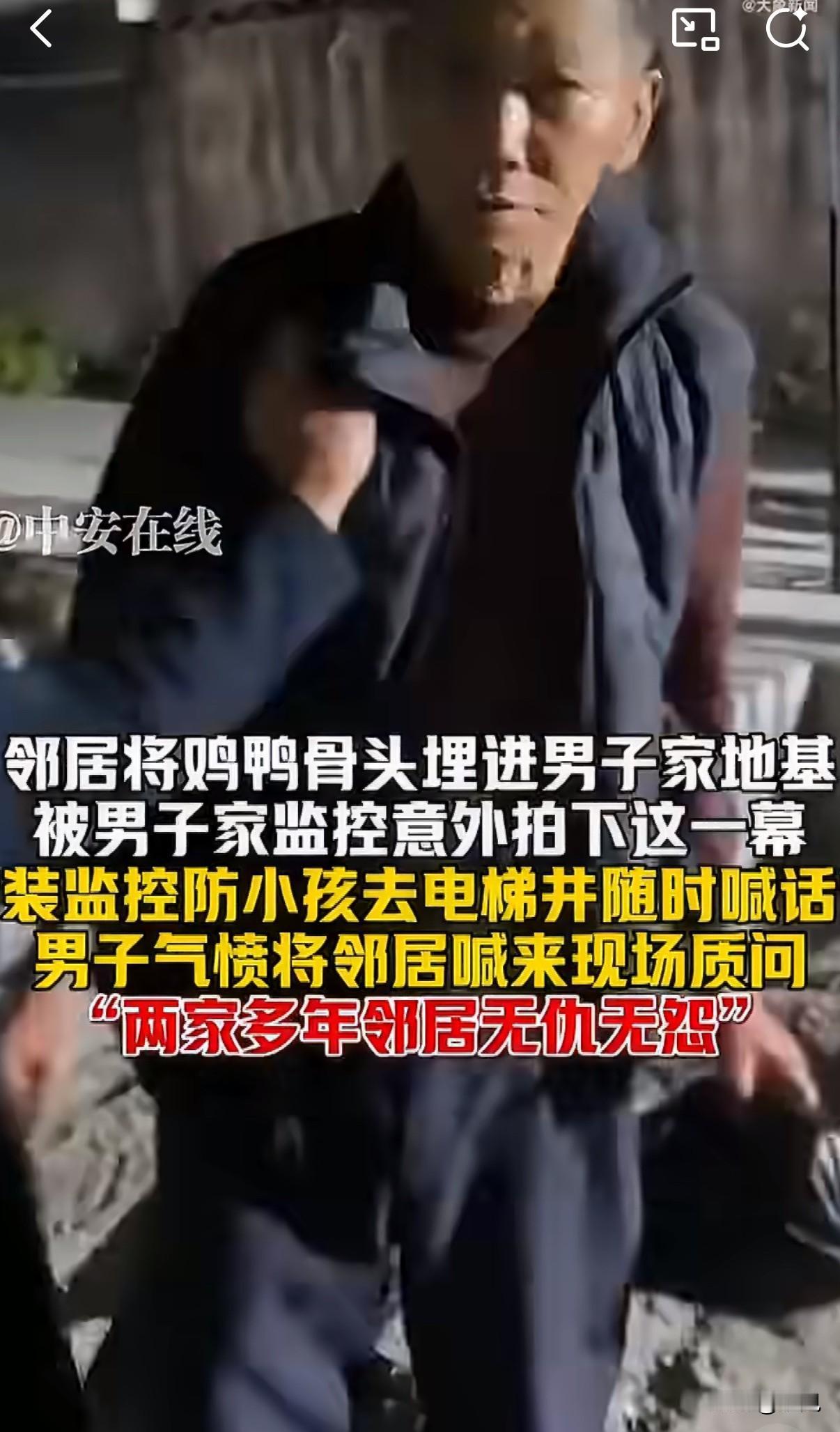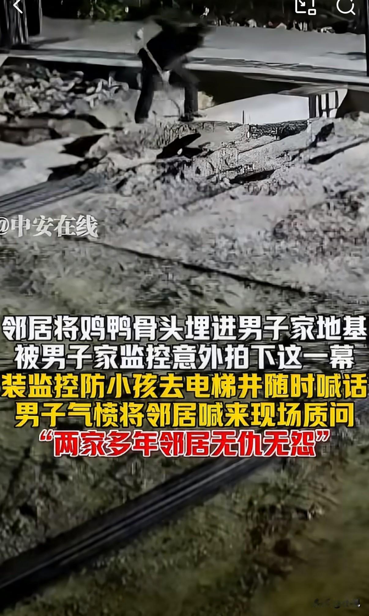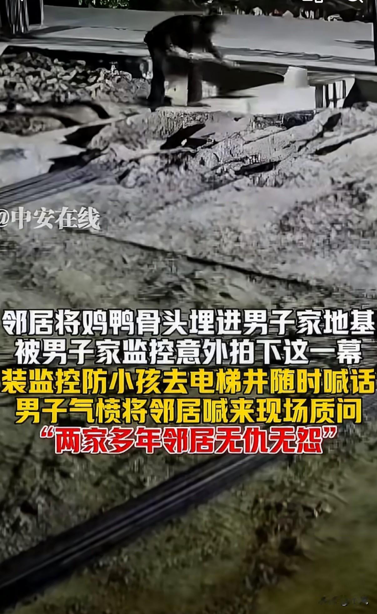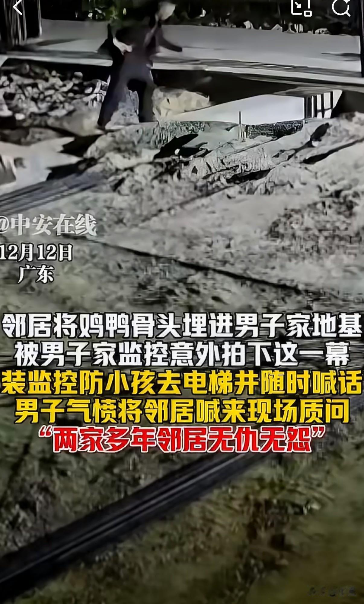 广东男子看监控气炸了。日夜相处的邻居,半夜偷偷在他家地基埋鸡鸭骨头。 这事儿是12月12日曝出来的。男子家里装了监控,原本是为了看着小孩,怕孩子去电梯井旁边玩,好随时喊话。没想到,回看监控时,看到了让人后背发凉的一幕。 夜深人静,邻居提着一个袋子,鬼鬼祟祟摸到他家地基附近。蹲下来,开始挖坑,把袋子里的东西倒进去埋好。放大画面一看,是鸡骨头鸭骨头。 男子立刻火了。多年的邻居,平时见面还打招呼,怎么也想不到会干这种事。他马上把邻居喊到现场,当面质问。 “你看看,这是你吧?你在我家地基埋这些东西,什么意思?”监控画面铁证如山,邻居一时语塞。 事情一传开,网上立马炸锅。很多网友说,这可不是小事,这是老辈人说的“厌胜之术”,故意埋秽物到别人地基,是诅咒人家倒霉,破坏风水。有农村来的网友讲,听过类似说法,这叫“埋祟”,是挺阴损的做法。 也有人猜,是不是因为男子家盖了新楼,还装了电梯,邻居心里不平衡,生了嫉妒,才用这种见不得光的方式泄愤。 目前官方没证实具体动机。但法律界的人说了,不管出于什么想法,这行为本身已经违法了。私自进入别人住宅区域,破坏他人财产,侵犯了别人的权益。 回头想想,挺让人感慨的。装监控是为了防意外,却意外照出了人心。平日里的和睦,可能只是表面。到底有多大的怨,或者多深的迷信,才能让人做出这种事。 两家以后怎么相处?这疙瘩怕是解不开了。信任一旦碎了,就像那埋进土里的骨头,看不见,但永远在那儿硌应着。 有些事,不上秤没有四两重,上了秤一千斤都打不住。一个监控,一段画面,让隐藏的冲突浮出了水面。人性啊,有时候真经不起细看。