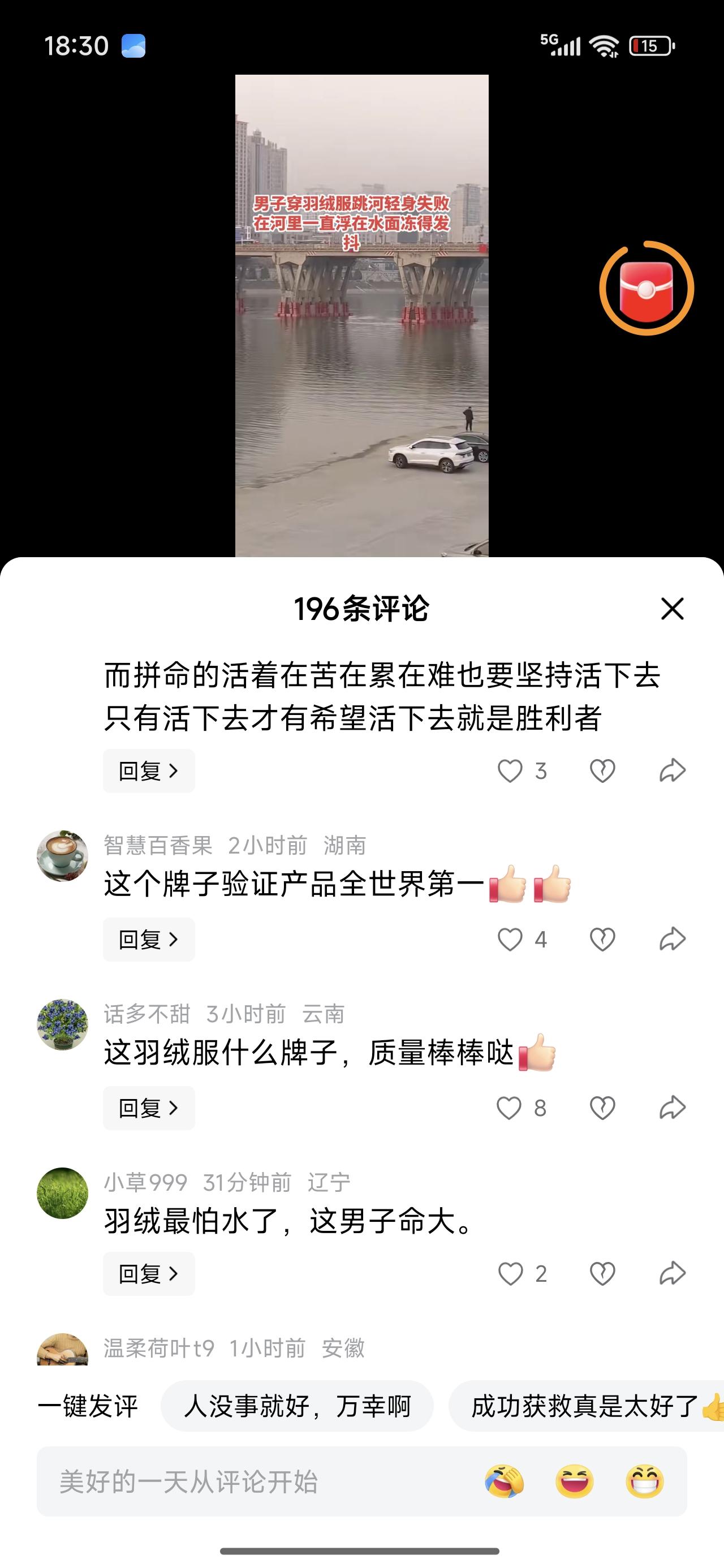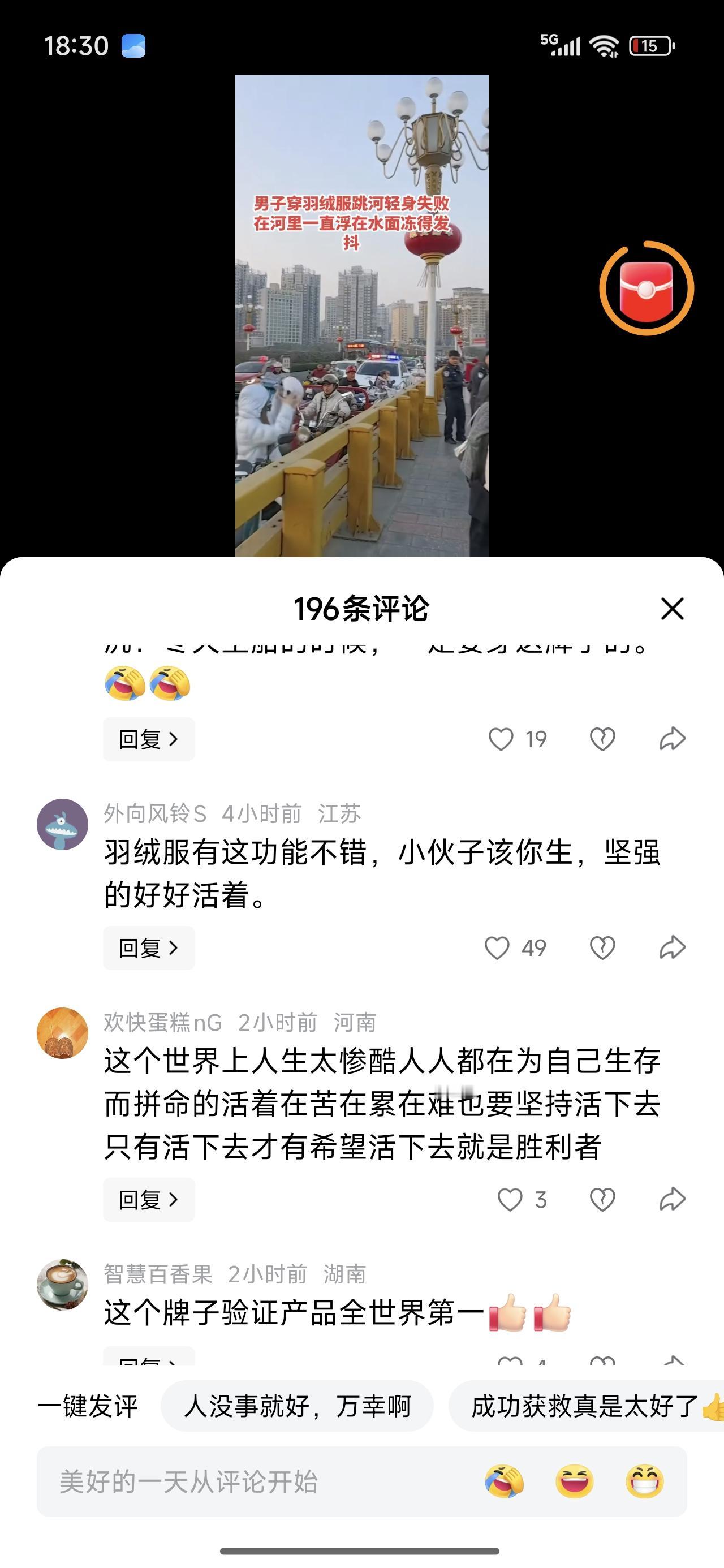 穿羽绒服跳河轻生失败。在水面漂浮冻得发抖。评论区里都在打听羽绒服的牌子。 中国人爱凑热闹的毛病,始终是改不了。还不赶快想办法救人。 是该感谢这个羽绒服商家,没有它兴许人就不在了。 巧了,衣服不容易浸水,还救了小伙子一命。知足吧,大难不死必有后福。没那么多想不开的事,将就活吧!