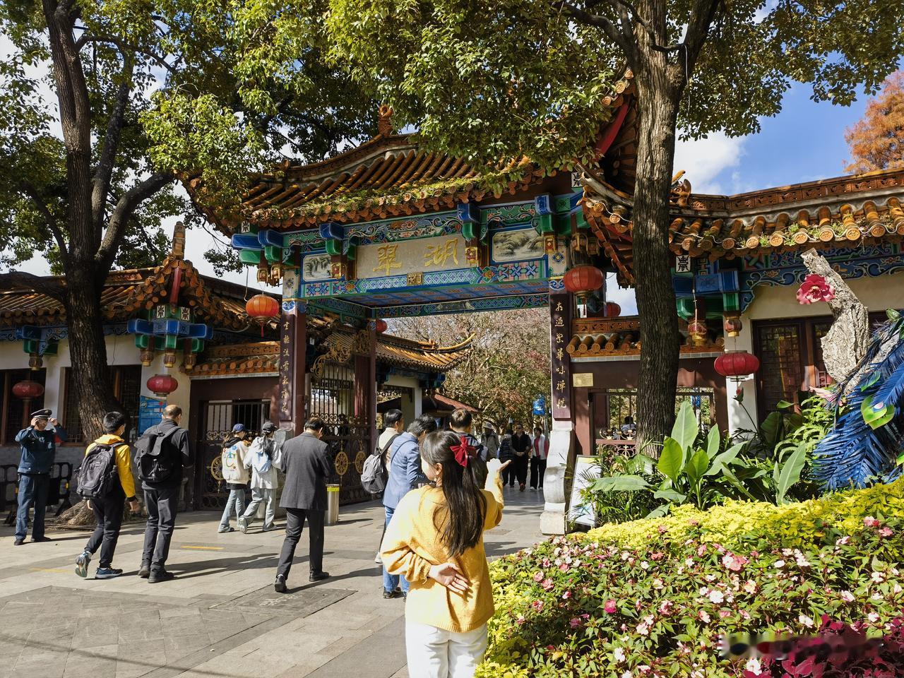 昆明翠湖公园东门,是翠湖公园的一个主要出入口。这里是进入唐堤的主要通道,也是去欣赏翠湖枫叶飘红的最佳出入口。 翠湖东门位于环湖东路边上,正对着卢汉公馆,导航可找到。东门门口鲜花簇拥,显得非常漂亮。 ✨体验:东门内侧有一块非常大的翠湖公园游玩示意图,游客可以事先规划一下公园的游玩线路。