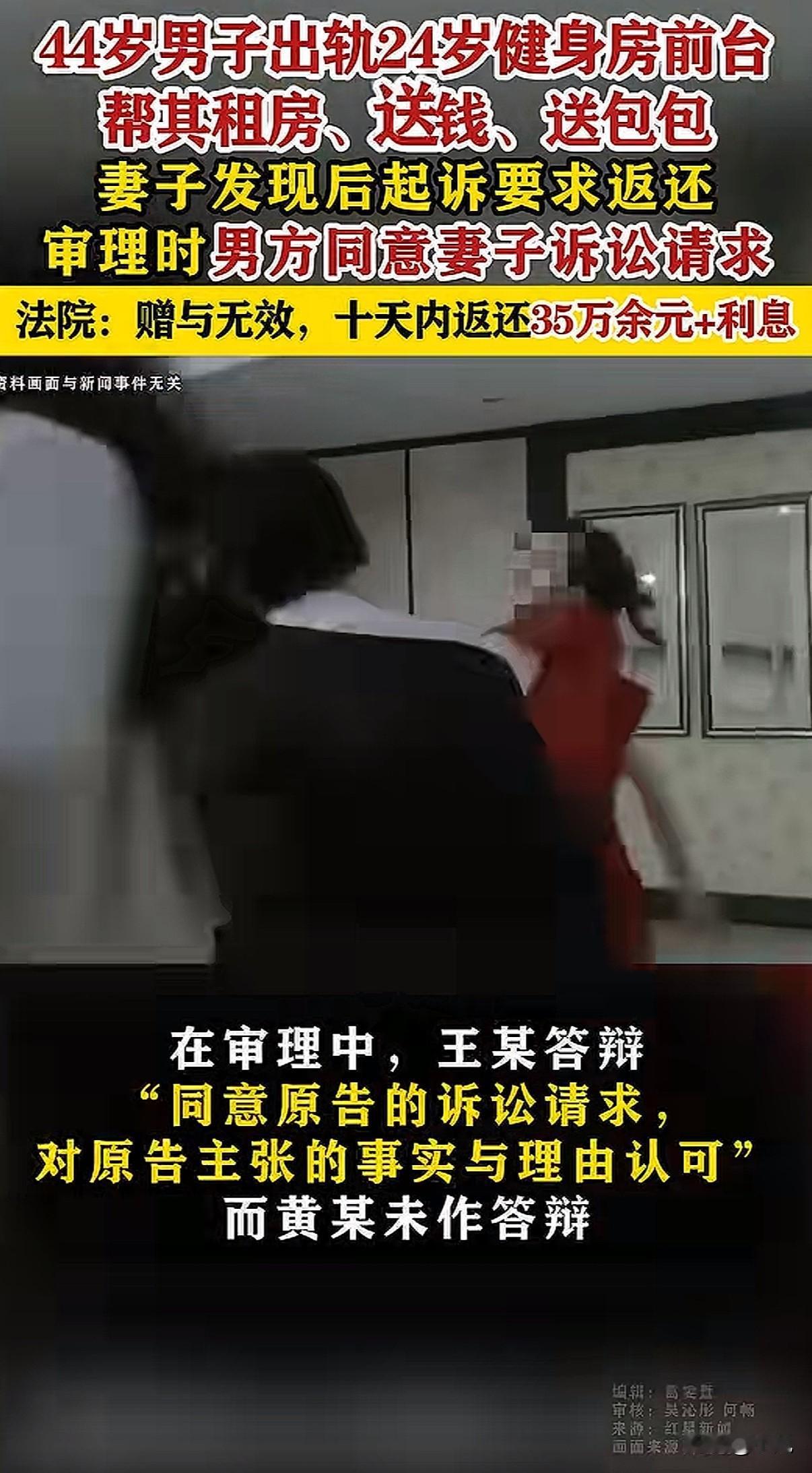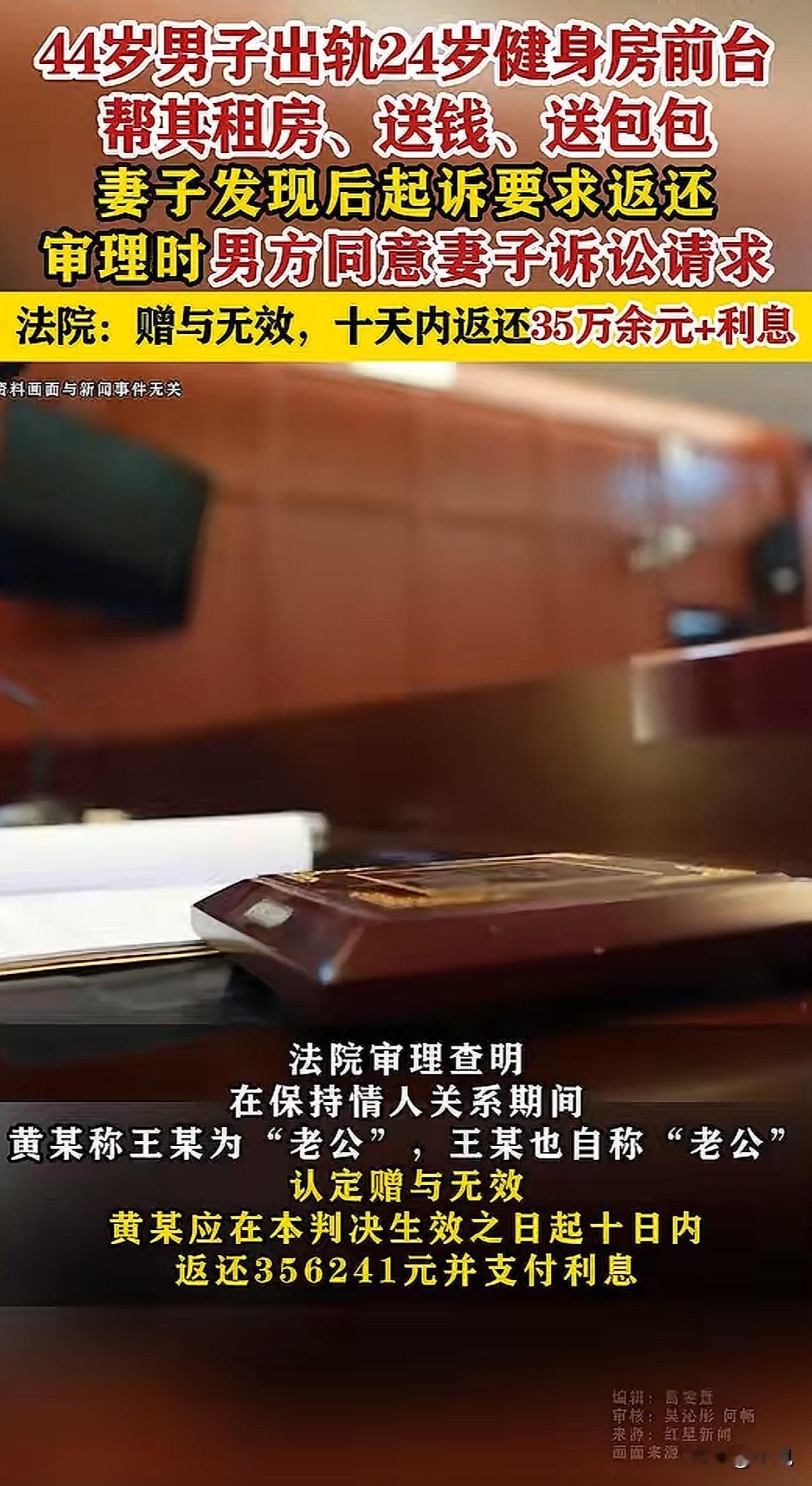 44岁已婚男给24岁健身房情人花了35万,法院一审判了:全还回来。 上海一男的姓王,44岁,家住黄浦区。去年10月,他在一家健身房认识了前台姑娘,姓黄,24岁,四川人。 两人都知道男方有家室,但还是很快发展成了情人关系。 王某在外面给黄某租了房子,算是俩人约会的地方。但有意思的是,报道里说,王某每晚都回家,从不在租的房子里过夜。 关系维持了13个月。这期间,王某给黄某转钱,买奢侈品包包、鞋子、手镯。微信聊天里,黄某叫他“老公”,他也自称“老公”。 总共花了多少钱?妻子魏某后来统计,起诉要求返还46万多。法院最后认定了35万多。 钱是夫妻一起赚的,王某一个人拿去哄情人开心,他妻子魏某能愿意吗? 今年初,事情败露了。3月份,王某断了和黄某的联系。同月,魏某直接把丈夫王某和情人黄某一起告上了法庭。 法庭上,王某的态度很“干脆”。他对妻子陈述的事实和诉求全部认可,同意让她把钱要回来。 那个姑娘黄某,没出声,没答辩。 黄浦区人民法院最近判了。判决书里写得很清楚:夫妻一方为了“与他人同居等违反夫妻忠实义务的目的”,把夫妻共同财产赠给别人,这行为违背公序良俗,无效。 法院说,综合两人的年龄差距、花费情况,黄某对王某已婚是知情的。她没有正当理由收这些钱。 所以,赠与行为无效。黄某必须在十天内,把35万余元加上利息,还给魏某。诉讼费的大部分,也由她承担。 我翻了一下,这种原配起诉讨钱的案子,结果差不多。 黑龙江,丈夫出轨给情人转20万,判全还。 云南,丈夫给情人转8万多,也判全还。 道理一样:婚内收入是共同财产,一方不能私自拿大笔钱给婚外情人,这损害配偶权益,也违背社会公德。 但还有个案子,结果完全相反。 福建,有个男的,明知道女方已婚,还给她转账送东西,花了15万多。后来两人闹翻,男的去法院起诉,要求女方还钱。 你猜怎么判?法院驳回了,一分没支持。 法院认为,你明知对方有家庭,还为维持不正当关系或结婚目的送钱,这目的本身不合法,法律不保护。 你看,同样是婚外情里的钱,原配去要,基本能拿回来;送钱的那方自己去要,可能就要不回来。 这里头的区别,挺值得琢磨。 法律在这事上,保护的是什么,不保护的是什么,好像挺明白的。 有些钱,拿着的时候觉得是“馈赠”,是“感情”。但在法律眼里,那可能就是必须吐出来的“不当得利”。 到头来,所谓的“感情投资”,很可能血本无归。 你觉得,这么判,合理吗?