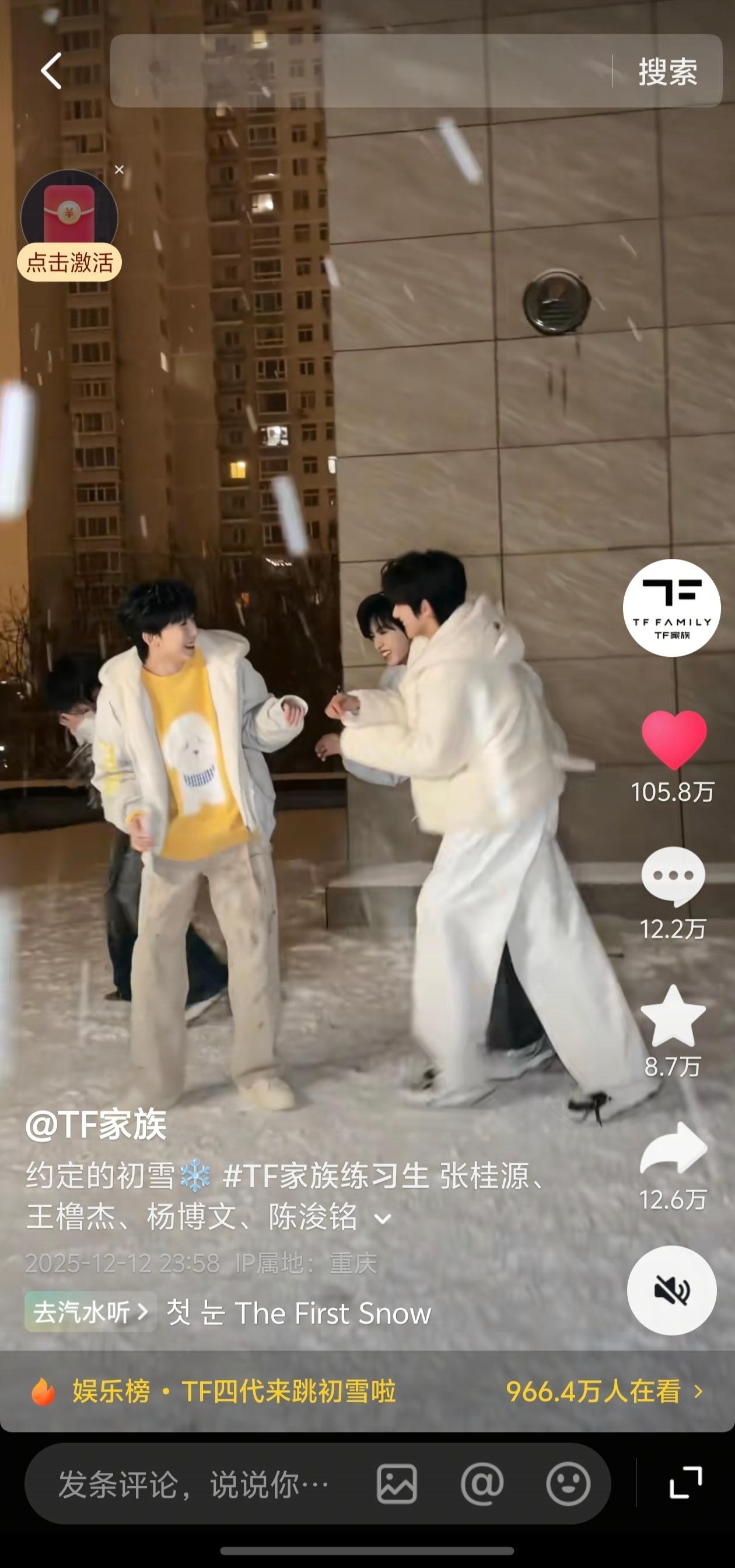 【TF四代】TF四代cha初雪了 杨博文 张桂源 王橹杰 陈浚铭初雪cha已经超100万👍了❄
