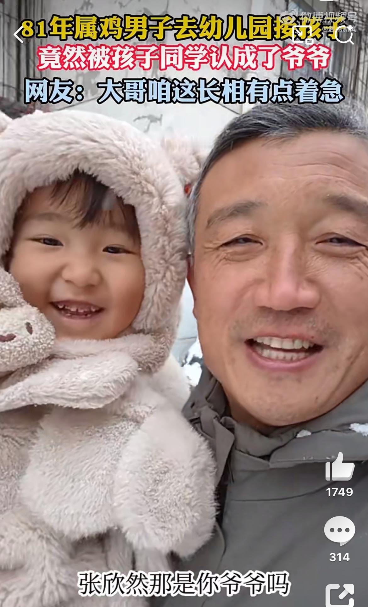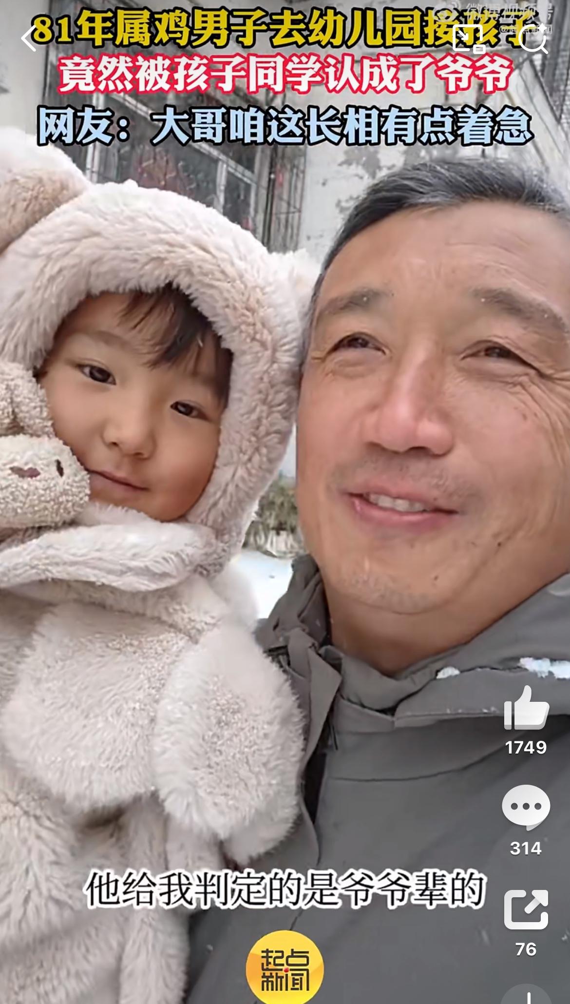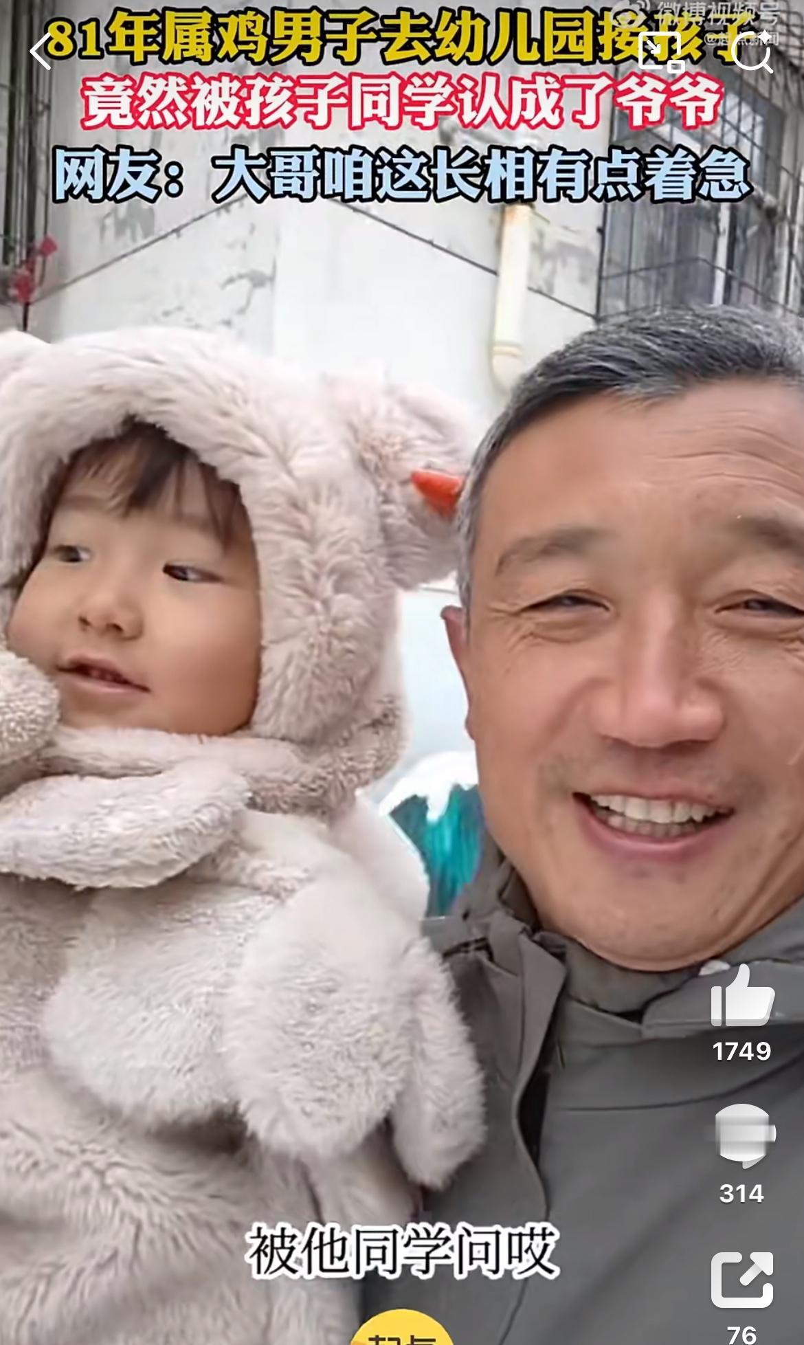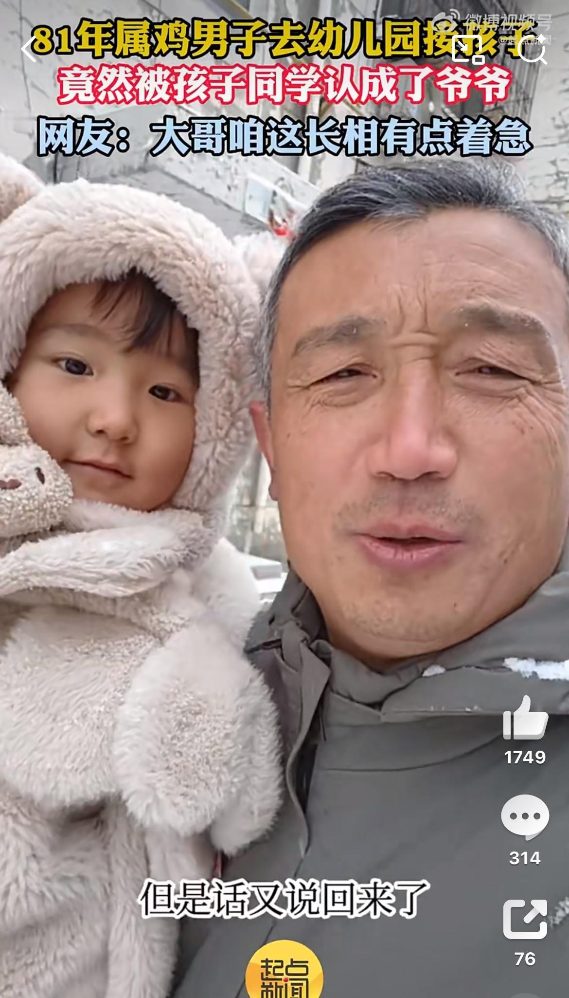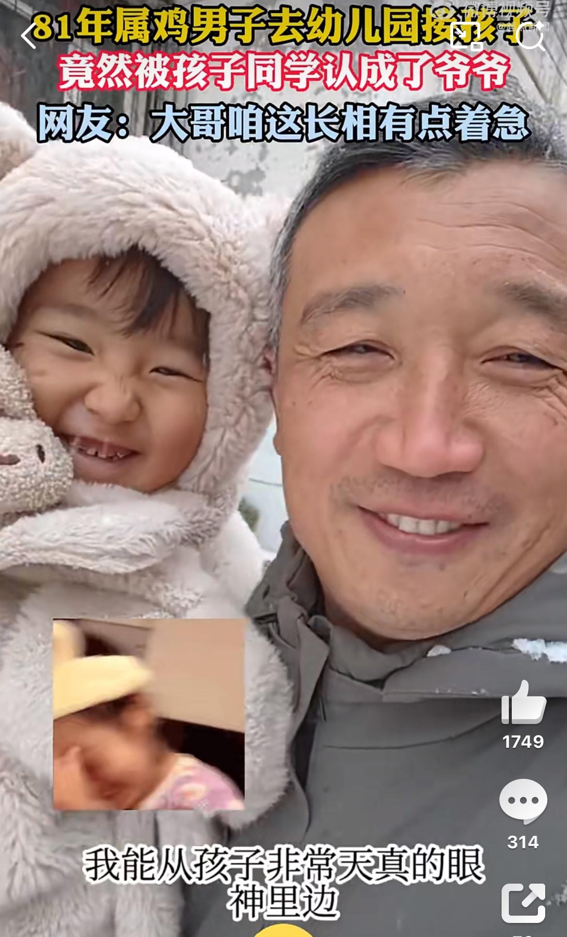 81年的男子幼儿园接女儿,被同学误以为是女儿的爷爷。看视频,这个81年的爸爸属实岁月沧桑了一点,头发白,眼角皱纹都能夹死苍蝇了,被孩子们误会实属正常。81年的44岁了,这是晚婚还是拼二胎三胎啊。普通人太晚生孩子,未来真的很麻烦,你老了,孩子还没大,你想托举他都无能为力。反而自己一身病,还成为他的拖累,两边不讨好。96年男孩 96岁的爸爸