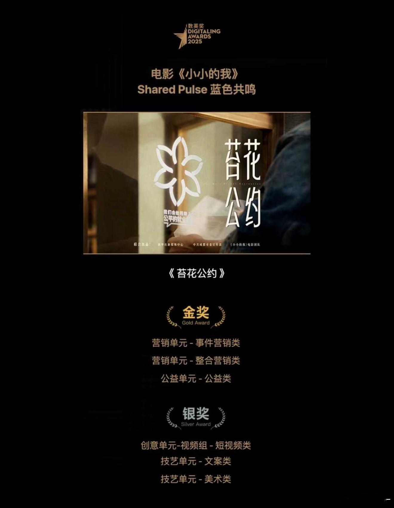 从银幕里的温暖叙事到现实中的公益回响,《小小的我》带着《苔花公约》斩获艾菲、数英奖的多项荣誉,这份关于人文关怀与社会价值的答卷,终将绽放出了属于苔花的光芒🌱