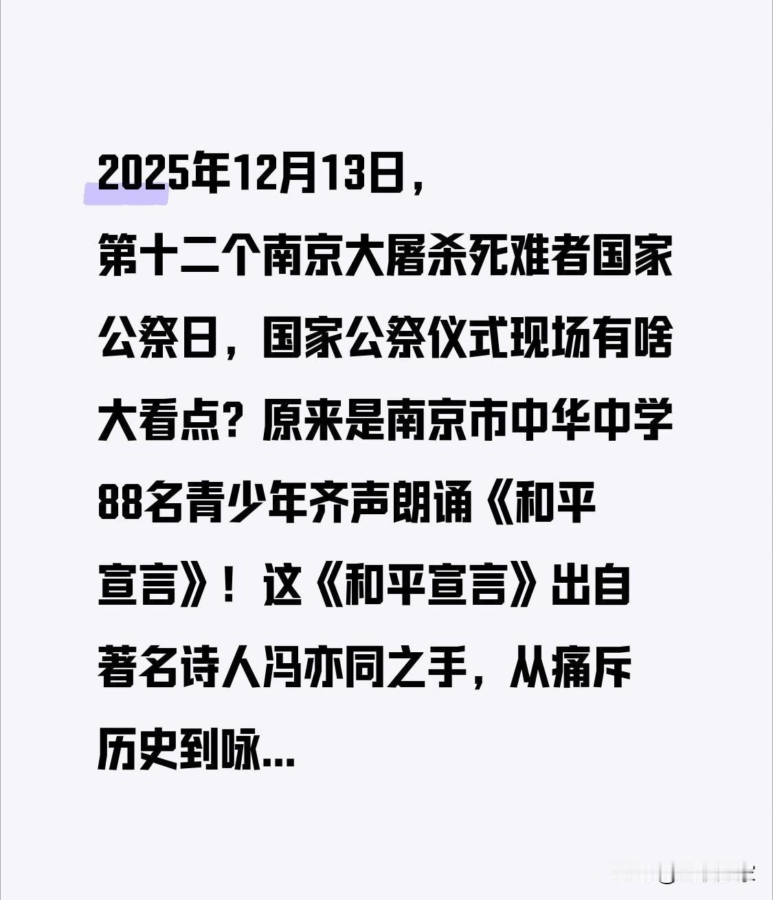 2025年12月13日,第十二个南京大屠杀死难者国家公祭日,国家公祭仪式现场有啥大看点?原来是南京市中华中学88名青少年齐声朗诵《和平宣言》! 这《和平宣言》出自著名诗人冯亦同之手,从痛斥历史到咏叹未来,满是城市记忆与人类祈愿。中华中学可是第五次承担这任务了,88名同学里有11名高二“老手”,其余是高一新生。早在招募时,报名人数就突破600人,经过选拔和集训,大家走进纪念馆触摸历史。高一学生段悦琳、邹泉都感触颇深。 这88名青少年用朗诵传承记忆,那未来又会有多少青春力量接力捍卫历史真相,发出和平的呼唤呢? 南京大屠杀 上海南京大屠杀 南京大屠杀 上海南京大屠杀 反人类大屠杀 国家公祭日 公祭日 第十一个公祭日 国家公祭仪式
