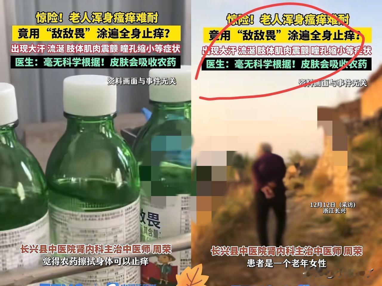 “悲剧还是发生了!”浙江湖州,一老人因浑身瘙痒,感觉浑身不舒服,看见桌上的农药,竟信偏方用农药涂皮肤止痒 结果不仅没缓解,反而引发中毒,大汗直流、肌肉震颤,幸亏家人及时送医才脱险,这些致命偏方真的要拉黑! 别以为农药只有喝了才致命,皮肤接触同样会被吸收中毒! 老人误信“农药能止痒”的谣言,把剧毒物品往身上抹,看似图方便,实则拿命冒险,这种毫无科学依据的偏方,从来不是救命,而是催命符! 尤其农村里这类害人偏方流传广,不少老人图省事轻信,却不知小毛病会拖成大危险! 身体不适别硬扛,更别乱试土方法,专业就医才是最靠谱的选择。农药是防虫的,不是治病的,别让无知和侥幸,酿成无法挽回的遗憾!