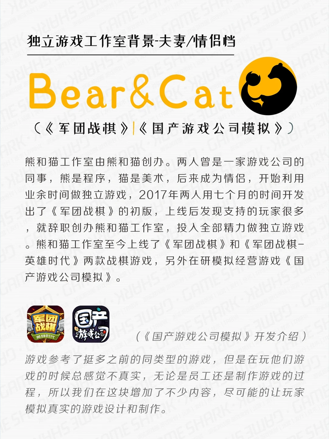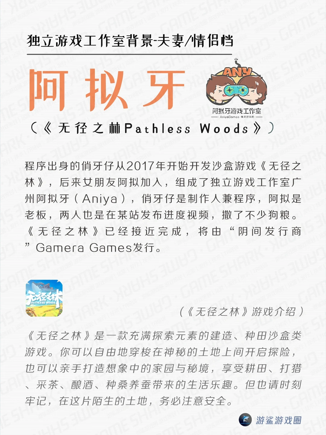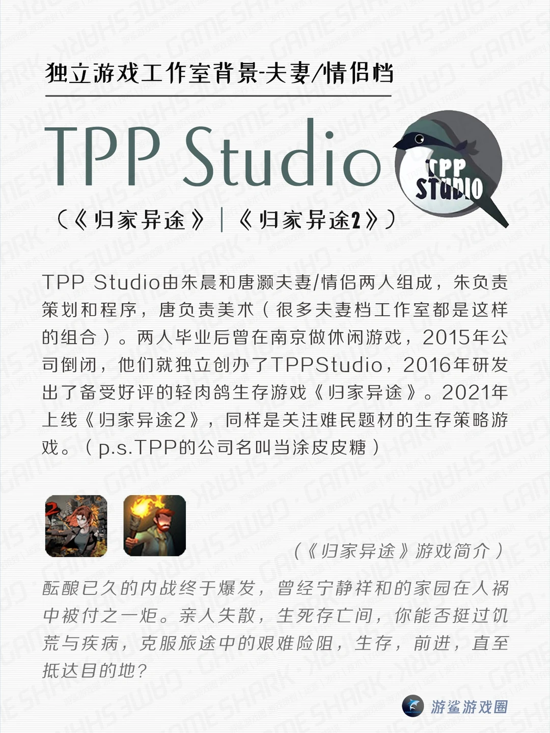 国外独立游戏行业有很多夫妻或者情侣二人组成(或创办)的工作室,比如开发《骑马与砍杀》的土耳其夫妻Armagan与Ipek,开发《Overland》《林中之夜》的Rebekah和Adam,以及《摄政纸牌》《暗影之手》Helen的Jake等等。随着国内独立游戏的发展,也出现了不少“夫妻档”独游团队。