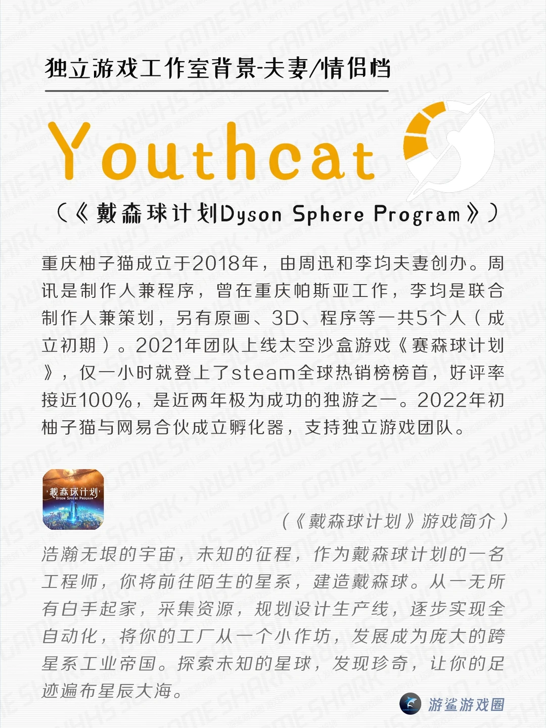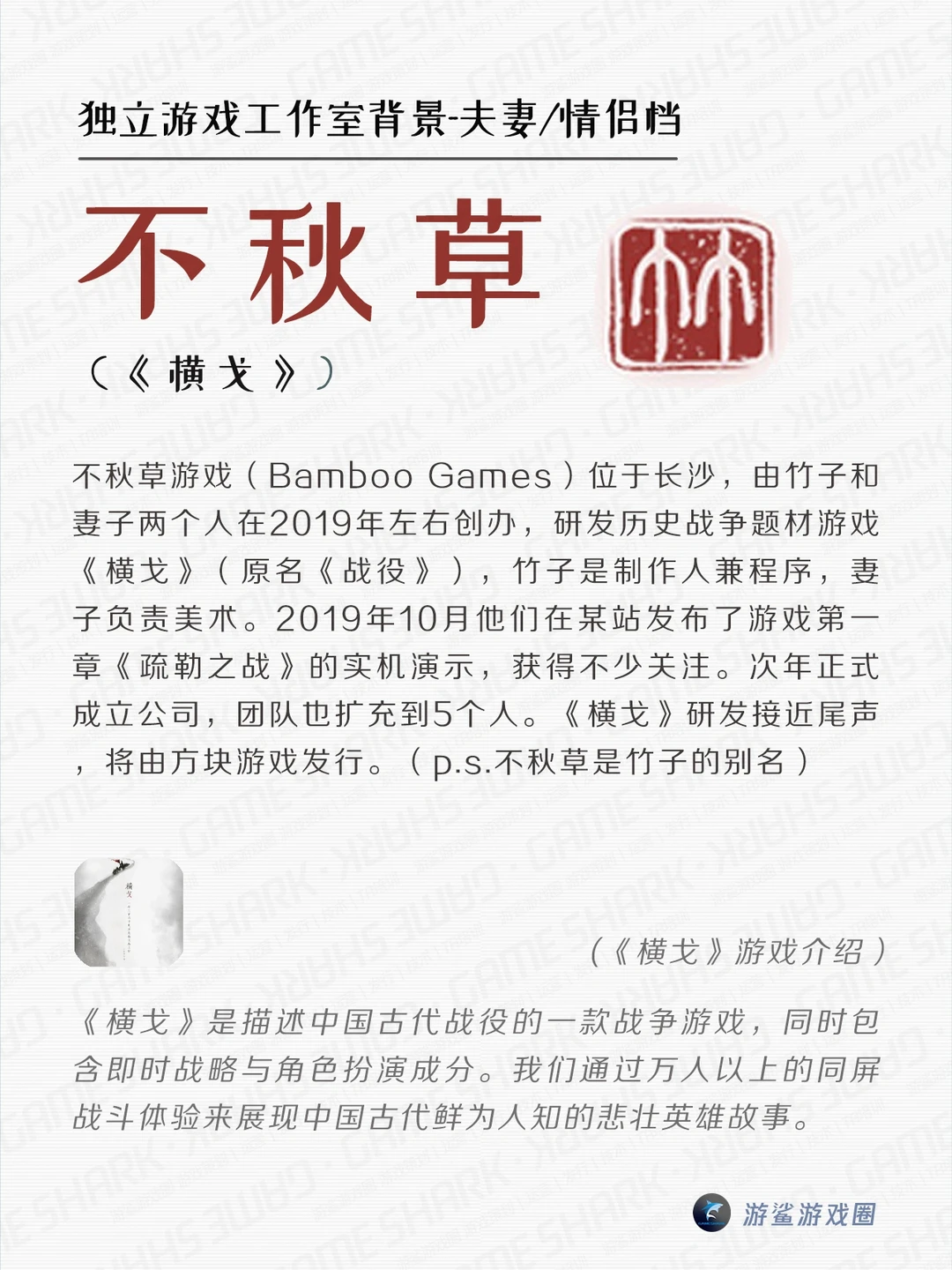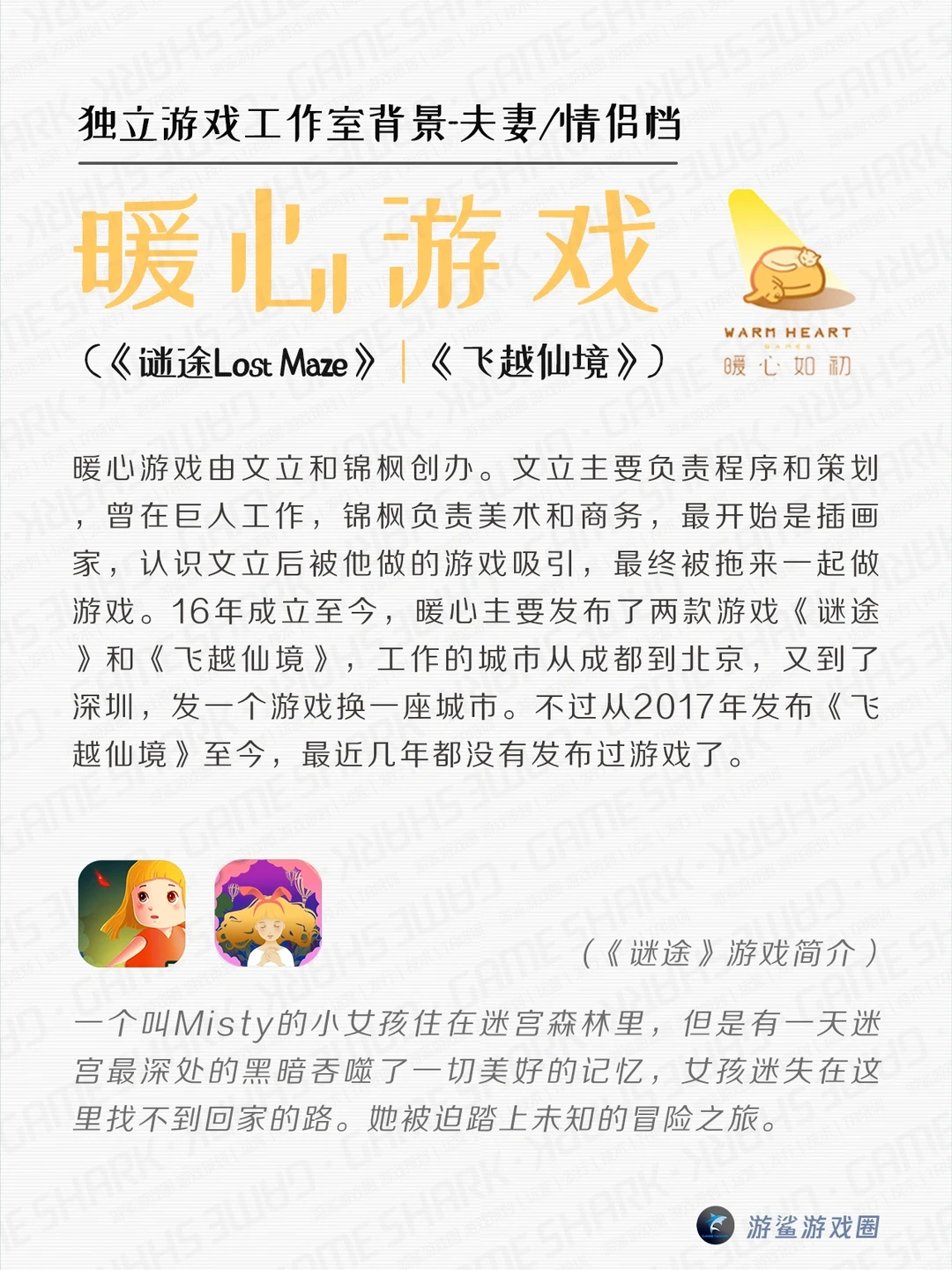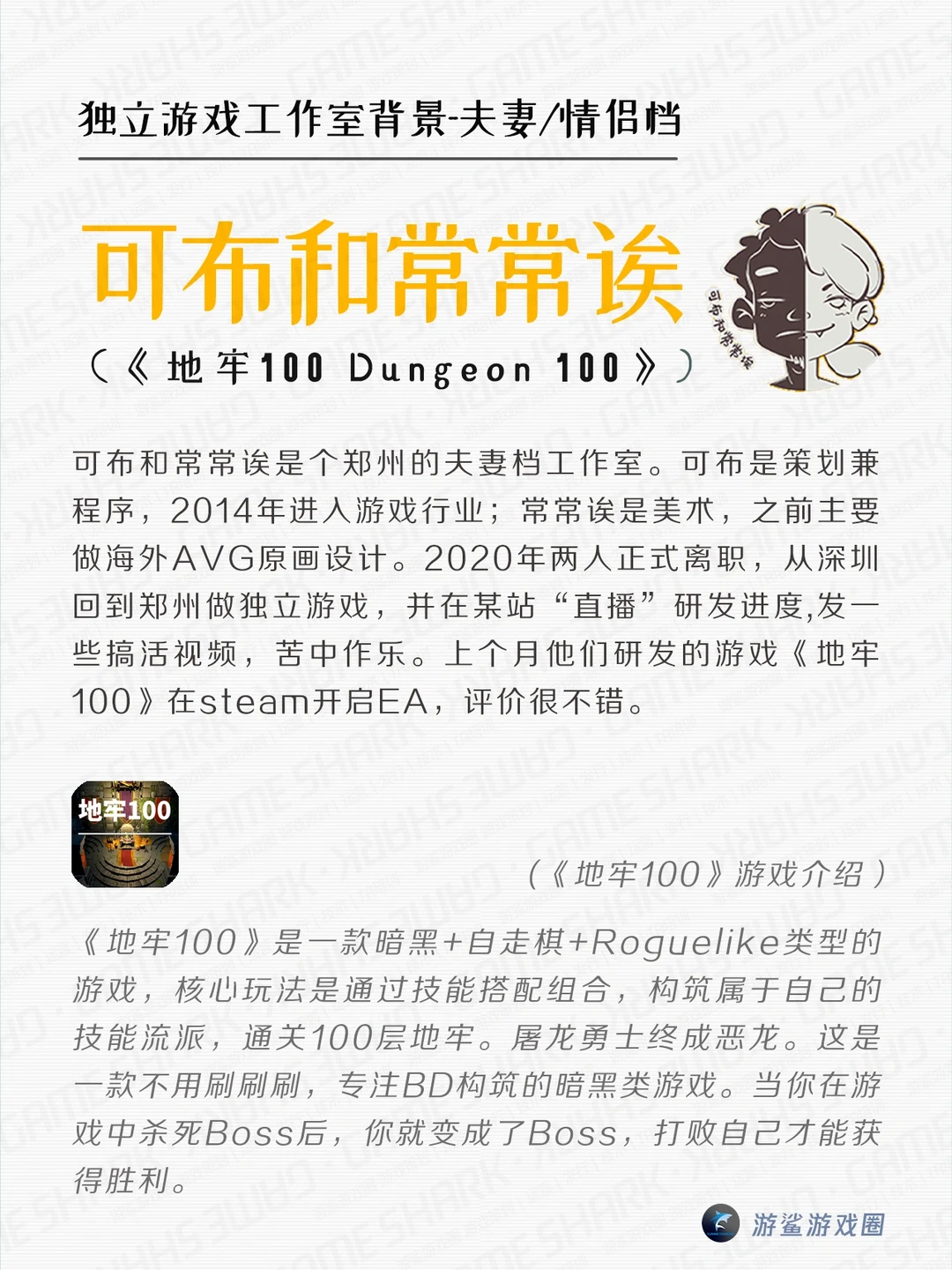国外独立游戏行业有很多夫妻或者情侣二人组成(或创办)的工作室,比如开发《骑马与砍杀》的土耳其夫妻Armagan与Ipek,开发《Overland》《林中之夜》的Rebekah和Adam,以及《摄政纸牌》《暗影之手》Helen的Jake等等。随着国内独立游戏的发展,也出现了不少“夫妻档”独游团队。