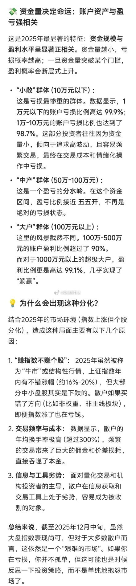 今年亏损的人,资金小于10万亏损比率98%,资金50万~100万亏损比率五五开,100万以上资金,亏损比率小于10%。。。。 。。这数据对吗?