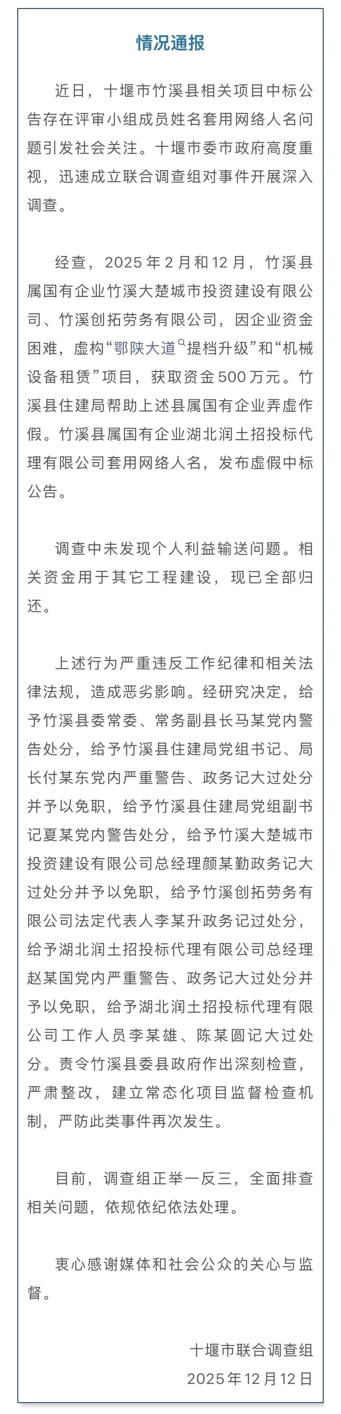 前几天网上火了“全网最忙五人组”的截图,好几个人名频繁出现在各种工程的中标公告里。湖北十堰的调查结果出来了,情况比大家想的还要离谱。 一句话概括:不是这几个人真那么“万能”,而是当地的公司为了走账弄钱,完全编了两个假项目,连专家名字都是从网上随便抄来套用的。 根据官方通报,事情是这样的: 1. 动机:当地两家县属国企(竹溪大楚城投和竹溪创拓劳务公司)资金困难,需要钱。 2. 操作:他们就想了个办法,虚构了两个根本不存在的项目,一个叫“鄂陕大道提档升级”,另一个叫“机械设备租赁”。然后,由当地的住建局配合走程序,搞了一场假的招投标。 3. 穿帮点:负责发布中标公告的代理公司(湖北润土公司),在编造评审专家名单时,偷懒直接套用了网上流传的“网红”人名,结果因为这几个人名在太多不同地方、不同领域的项目里出现,被网友发现并截图传播,事情这才彻底败露。 4. 钱去哪了:他们通过这两个假项目,一共套出了500万资金。通报说,钱被用于其他工程建设,并且现在已经全部归还了。调查也称没发现个人从中捞钱。 处理结果挺重的: 从副县长、住建局局长,到具体操办的三家公司的负责人,一共9个人被处分。其中住建局局长和两家公司的总经理直接被免职。同时,上级也责令竹溪县委县政府做深刻检查,要求他们建立监督机制,防止再出这种事。 这件事之所以让人看了无语,在于它暴露出的问题层次: · 第一层是荒唐:造假已经够严重了,连编人名都懒得动脑子,直接上网抄,导致“穿帮”,显得极其不专业和儿戏。 · 第二层是系统性失灵:这不是一两个人能办成的。从企业申请,到主管部门(住建局)配合审批,再到代理公司操作发布,一整条线上多个环节都“开了绿灯”,说明内部的监管流程形同虚设。 · 第三层是动机背后的困境:虽然做法错误且违法,但起因是“县属国企资金困难”。这或许也反映出一些地方基层国企的真实经营状况和融资压力,只是他们选择了一条最错误的路来解决问题。 最终,几个网上抄来的名字,意外地扯出了一场地方上的虚假项目套现案。处理了一批人,但如何从根本上改善基层治理、规范国企运营、堵住监管漏洞,可能是比处分更需要思考的问题。
