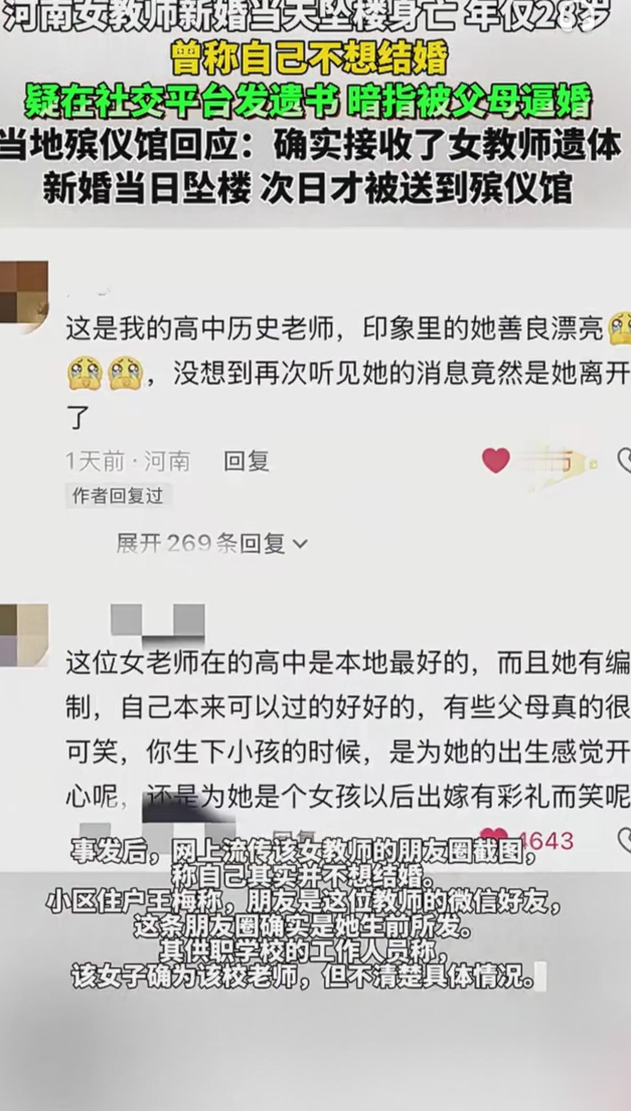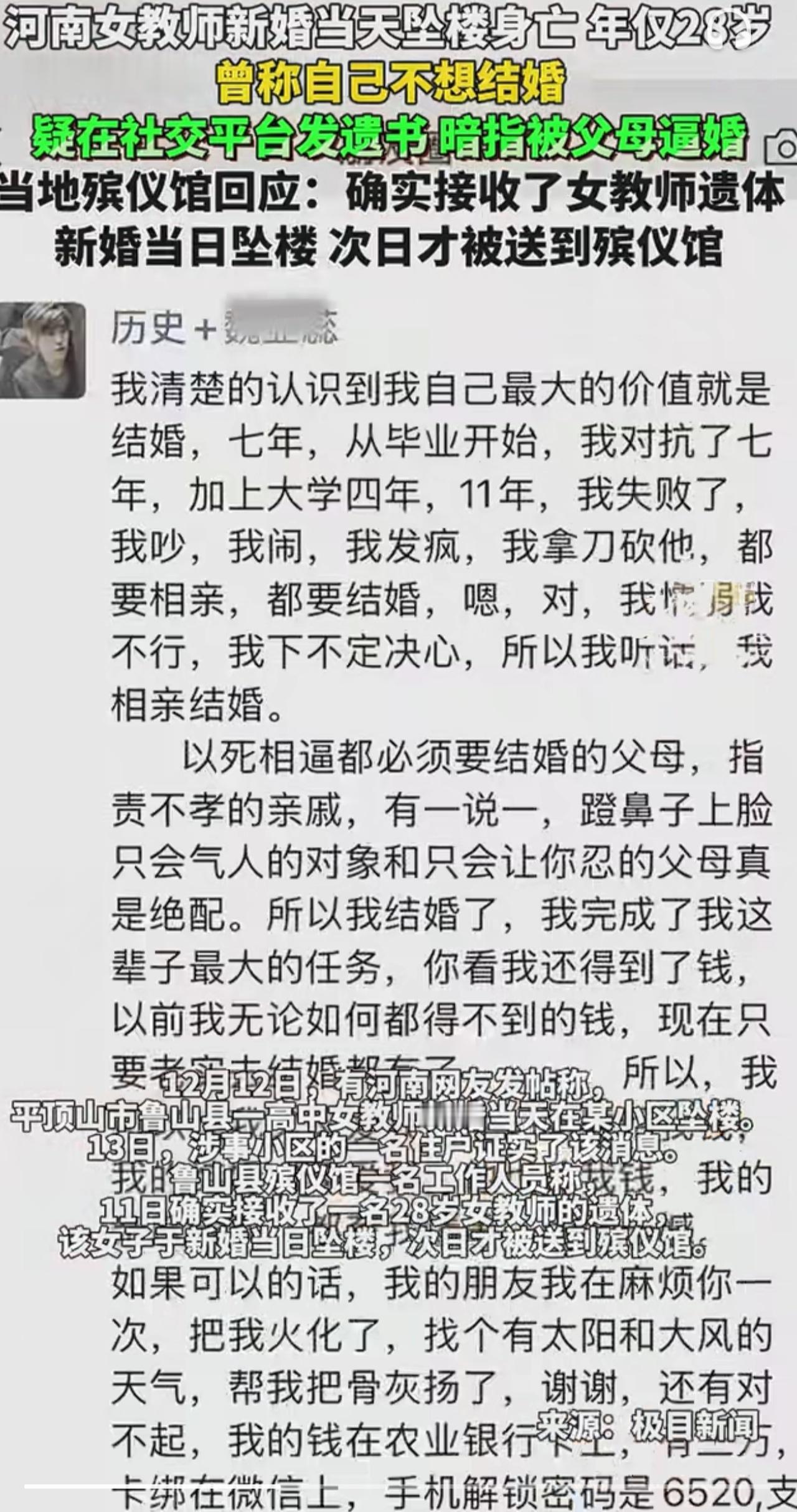 干啥呢嘛,以后我的孩子要是不想结婚就不结呗。我们刚刚把孩子生下来的时候不就是希望他快快乐乐健健康康的嘛。 河南女教师新婚当天坠楼身亡 年仅28岁。 曾称自己不想结婚,疑在社交平台发遗书 暗指被父母逼婚。 当地殡仪馆回应:确实接收了女教师遗体,新婚当日坠楼 次日才被送到殡仪馆。 有啥比健健康康的活着更重要的嘛,想不通。像视频里这种那么好的姑娘就这么不在了,做父母的咋想的? 被逼结婚是压跨她的最后一根稻草,可能从小就被逼着干了很多违心的事情,说了对抗了11年