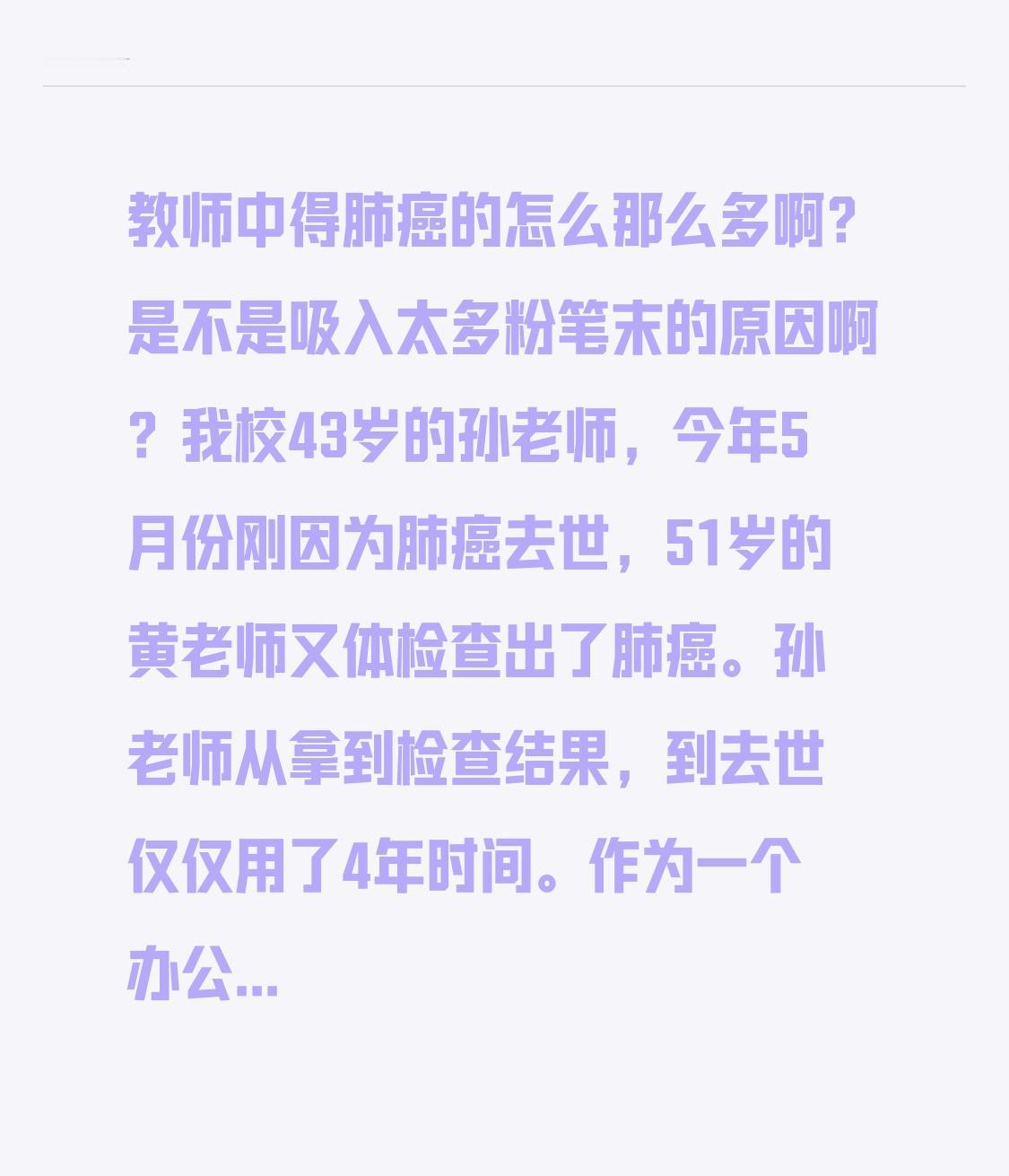 教师中得肺癌的怎么那么多啊?是不是吸入太多粉笔末的原因啊? 我校43岁的孙老师,今年5月份刚因为肺癌去世,51岁的黄老师又体检查出了肺癌。 孙老师从拿到检查结果,到去世仅仅用了4年时间。 作为一个办公室里的同事,这一情况黄老师知道的清清楚楚的,所以现在思想压力特别大。 最近同事们在一起聊天的时候,经常讨论的话题就是,是不是吸入了过多的粉笔末,所以才会导致教师容易患上癌症啊? 我校有多媒体不假,可是年纪大的老师都不喜欢用,觉得多媒体展示的太快,学生吸收不了。还是一笔一划的板书才能让学生记得更牢。 听公开课时我和同事们还讨论过“中老年教师不喜欢使用课间”的话题,但是,到底是不是因为中老年教师爱板书,吸入了过多的粉笔末,所以才导致得了肺癌啊?有没有懂行的人给我们一个答案? 另外一个原因可能就是,教师经常被学生气伤,多气伤肺也是中医里的一个观点。 当代学生个性太强,顶撞老师那是家常便饭,甚至有些学生以把老师气得七窍生烟为乐趣。 当面叫老师姓名,写纸条辱骂老师,用水瓶砸老师,越是敬业的老师,越是受不了学生的这些行为,越容易精神内耗。 孙老师和黄老师,都是我校的教学骨干,他们这么年轻就得这么凶险的病,到底和以上两方面的原因,有没有什么关联啊? 有没有懂行的人帮我们解答一下?