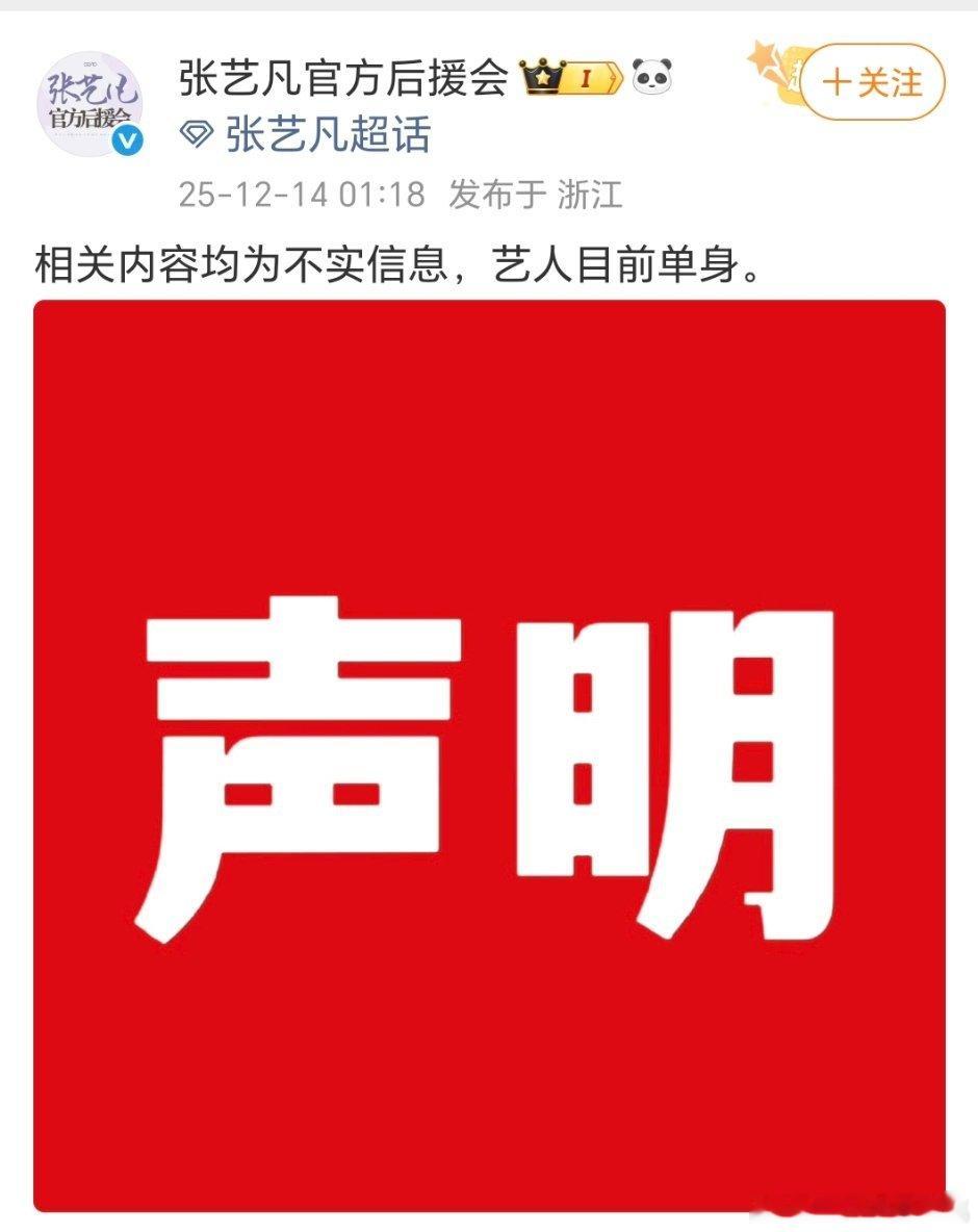 张艺凡后援会声明艺人目前单身张艺凡后援会发声明辟谣网传新闻,艺人目前单身