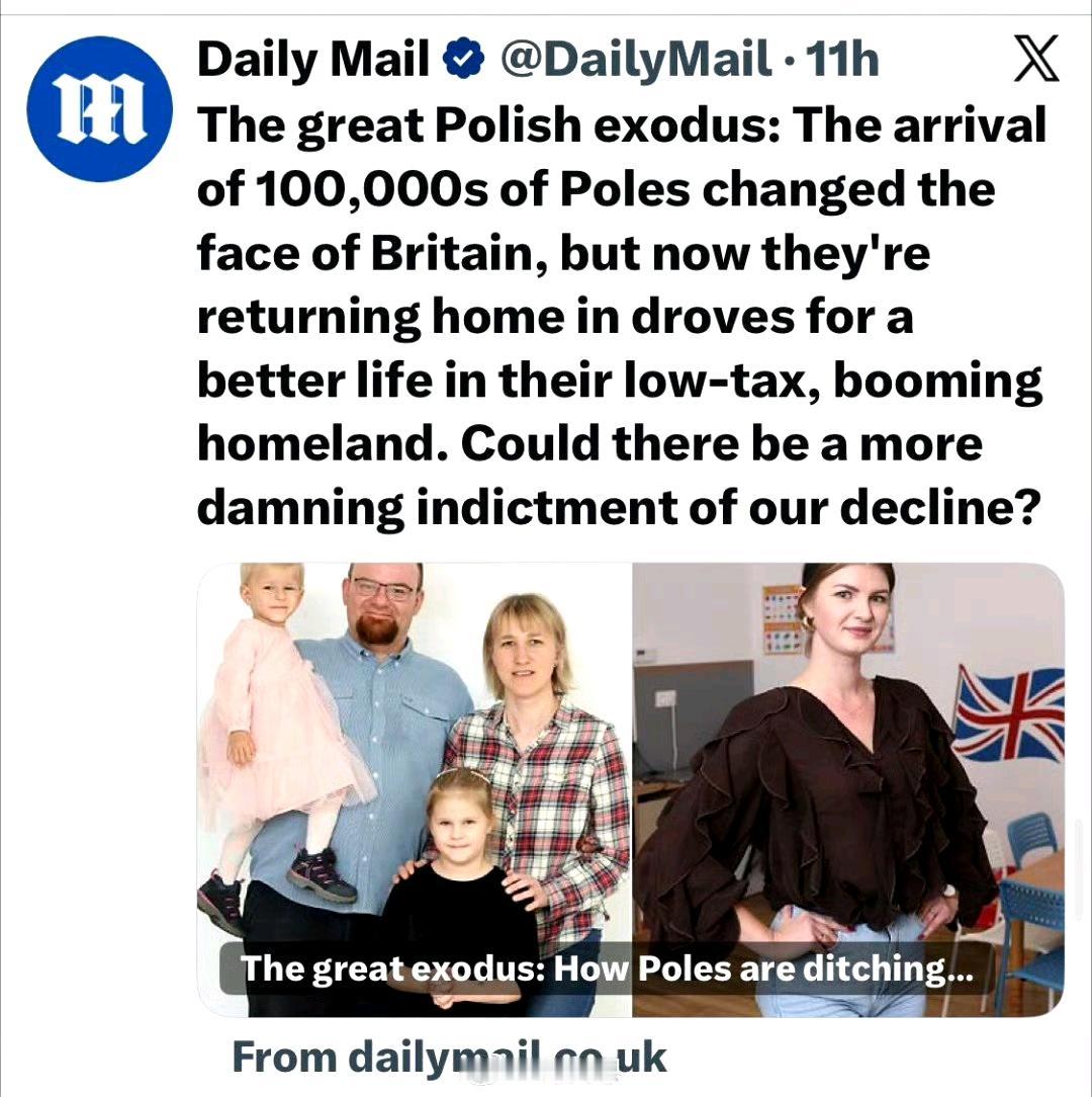2004年波兰加入欧盟并获得在欧洲其他国家工作的权利后,超过10万波兰人最终移居英国工作。如今英国经济停滞不前,且穆斯林人口不断增加,社会冲突加剧,英国已经不是大家向往的英国。许多波兰人选择回国工作或者到其他国家找工作。在英波兰人大量流失(有的返回波兰,有的转战欧盟其他国家),仅2024年至2025年6月,就有4.3万波兰人离开英国。这一现象引起了英国社会的高度关注,每日邮报12月5日、6日以专题报道的形式,深度解析这一社会现象。这一报道的背后透露出深深的焦虑,隐含着“英国怎么了”的思考。所以说一千道一万,人口才是一个国家的基石。