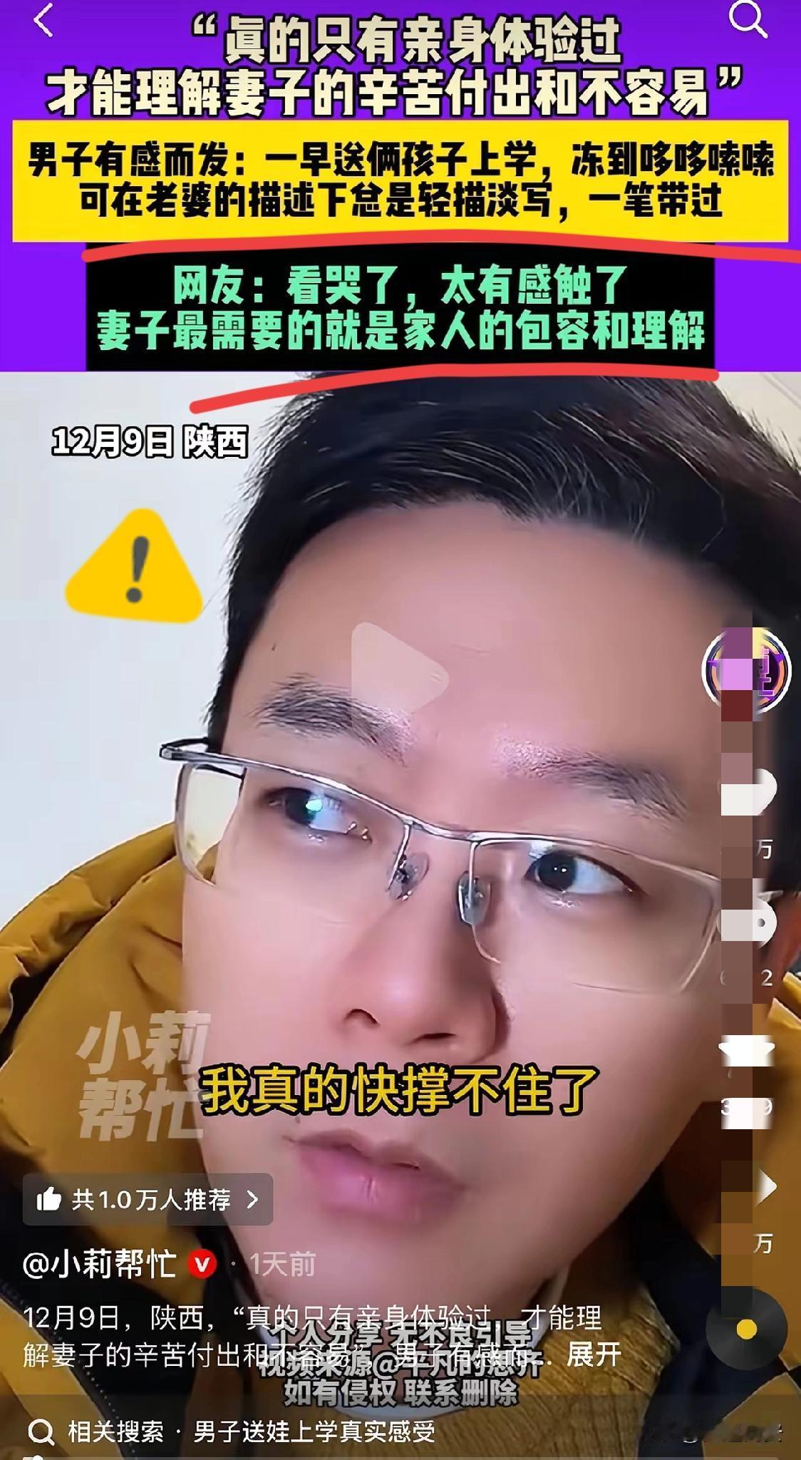 近日,陕西一男子有感而发,因妻子生病,他早晨送俩娃上学,被冻的哆哆嗦嗦,可老婆每次都是给他轻描淡写的描述,他感慨:只有亲身体验过,才能理解妻子的辛苦付出和不容易! 陕西男子替生病妻子送娃两天就扛不住,寒风里冻得手僵的滋味,才让他懂了妻子常年默默扛下的琐碎有多磨人。太多男人总觉得老婆持家带娃轻松,一句“不就是看个孩子吗”,藏着对伴侣付出最敷衍的无视,却忘了那些轻描淡写背后,全是日复一日熬出来的疲惫。 婚姻里最伤人的从不是缺钱少爱,而是你的拼尽全力,在对方眼里不值一提。育儿家务从不是某个人的独角戏,那些被切割成碎片的时间、停不下来的琐事,从来都不轻松。真正的心疼从不是嘴上情话,而是主动搭把手的实在,是看见对方付出的真心。 别等亲身经历才懂伴侣不易,日常多份体谅多些分担,日子才能暖起来。你家有没有过这种“体验后才懂对方辛苦”的时刻?评论区聊聊~