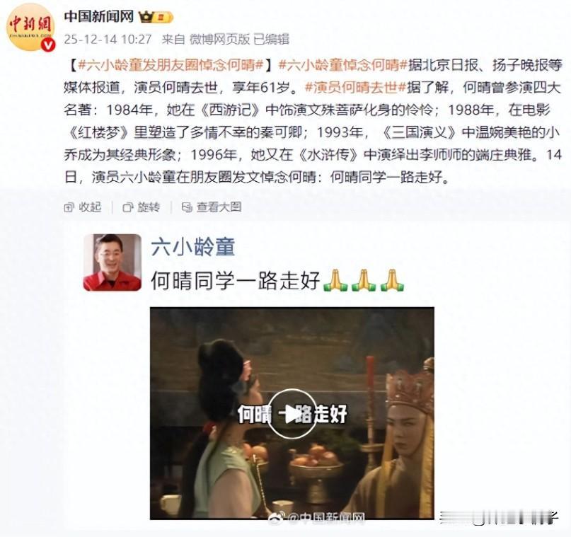 刚看到六小龄童朋友圈:何晴同学一路走好。 昨晚刷手机时,一位老同事转给我这条消息,我愣了半天——何晴去世了,才61岁。 她可是唯一演全了四大名著的女演员啊,1984年就在《西游记》里扮文殊菩萨化身的怜怜,那灵劲儿我小时候天天学。 现在一想到她那些角色再也看不到了,就觉得心里空落落的。你们身边,有这种突然就再也见不到的回忆吗?