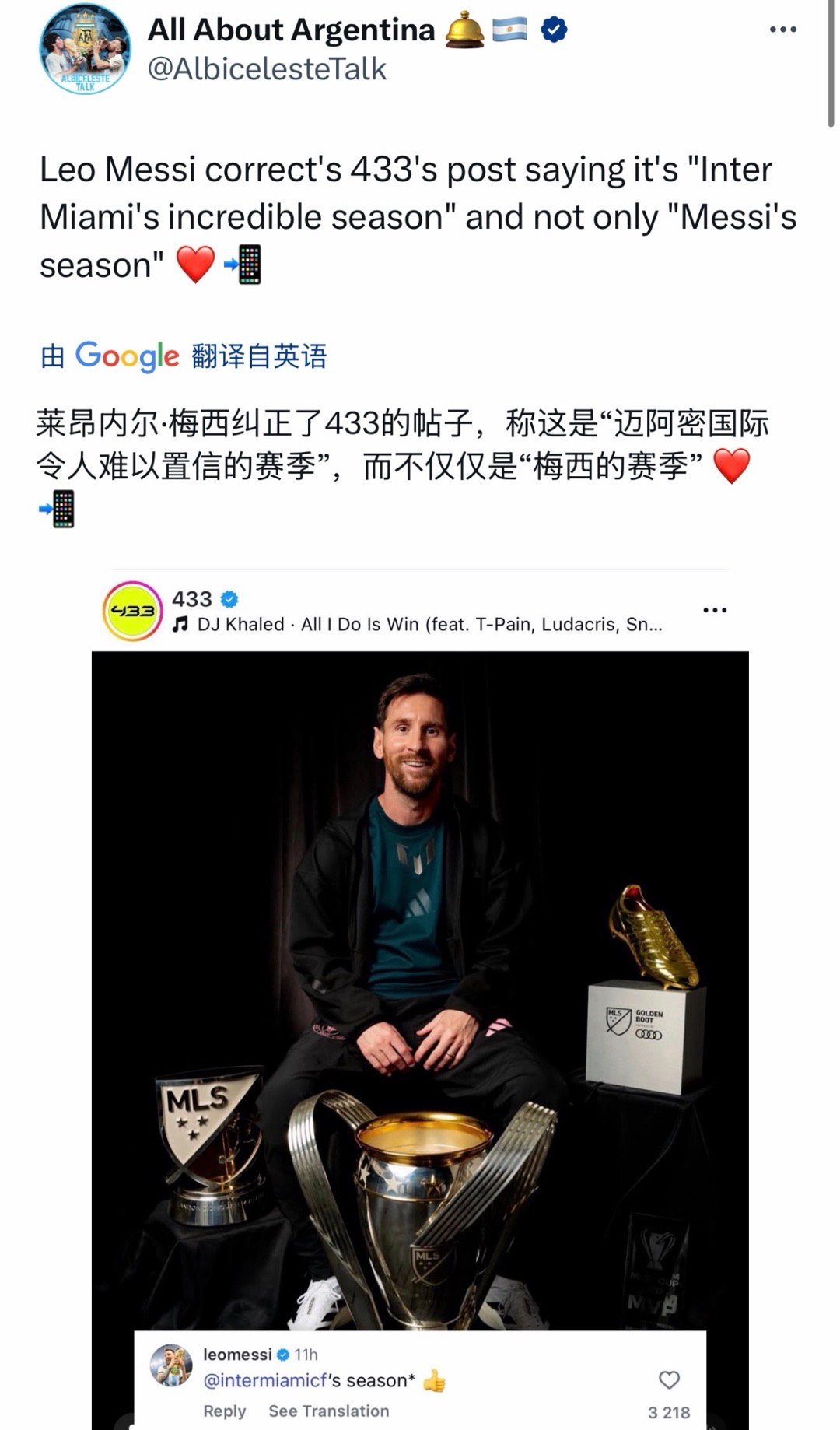 433社媒发文祝贺梅西夺冠:A photo that shows Messi’s incredible season 🤯📸(一张照片展现梅西不可思议的赛季 🤯📸),称这个赛季是“梅西的赛季”,而梅西在IG评论区回复纠正,强调胜利是“属于迈阿密国际全队”(intermiamicf’s season)。赢球分享,输球担责,从不自私,永远谦逊,把团队放在第一位的梅西梅西印度行第二站有序开展梅西印度行闹剧收场梅西印度活动只待10分钟球迷怒砸场