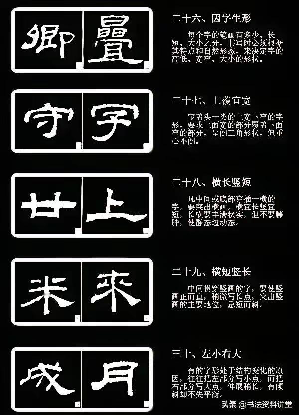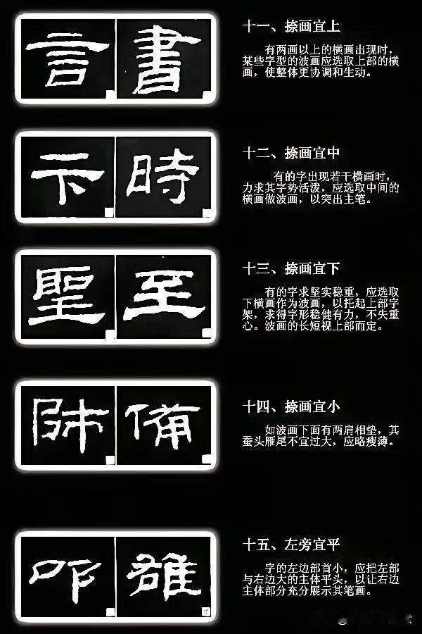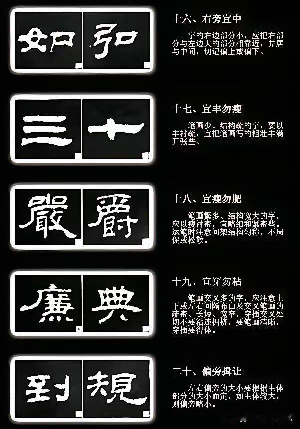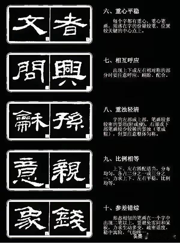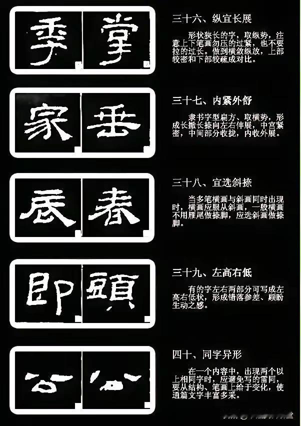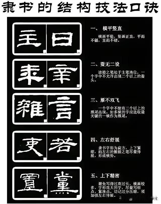 跟着技法写隶书!要写好隶书,核心在于吃透历代书家凝练的结构技法口诀,以口诀为纲,拆解笔法与结体的精髓。 隶书的根基在笔画:“横平竖直”奠定沉稳基调,“蚕无二设”“雁不双飞”划定波磔准则——起笔的蚕头忌重复堆砌,收笔的雁尾莫多余张扬,每一笔的轻重、向背都需贴合法度。结体上则遵循“左右舒展”“上下精密”,既要让横向笔画放开姿态,又要保证纵向结构紧凑规整,拿捏好重心、比例与呼应关系,才能避免松散或局促。 这些口诀与“方劲古拙,蚕头雁尾”的隶书要诀一脉相承,搭配典型例字学习,可将抽象技法具象化。唯有逐句琢磨、反复临习,让口诀内化为书写直觉,才能跳出形似的表层,真正捕捉隶书的古拙韵味,落笔既有法度约束,又含气韵生动。 口诀掌握了,规则摸准了,但要写好隶书,除多写多练外,还要有书法专业老师指点!不经老师指点的书法,即使是隶书也能写出江湖体来,现在网友写的江湖体比比皆是!