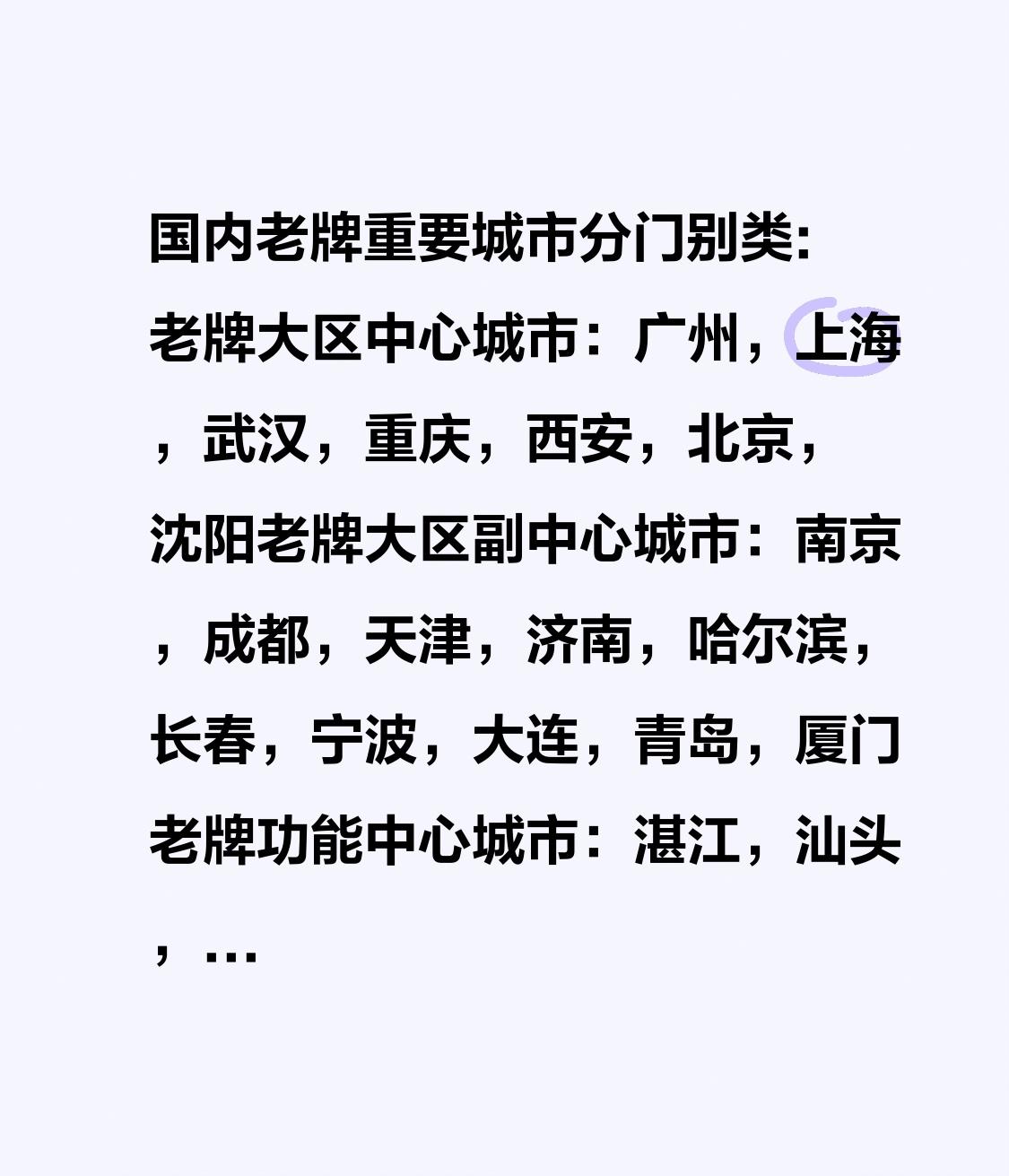 国内老牌重要城市分门别类: 老牌大区中心城市:广州,上海,武汉,重庆,西安,北京,沈阳 老牌大区副中心城市:南京,成都,天津,济南,哈尔滨,长春,宁波,大连,青岛,厦门 老牌功能中心城市:湛江,汕头,泉州,柳州,衡阳,徐州,襄阳,绵阳,宜宾,宝鸡,洛阳,兰州,包头,邯郸,唐山,大庆,吉林,鞍山,本溪