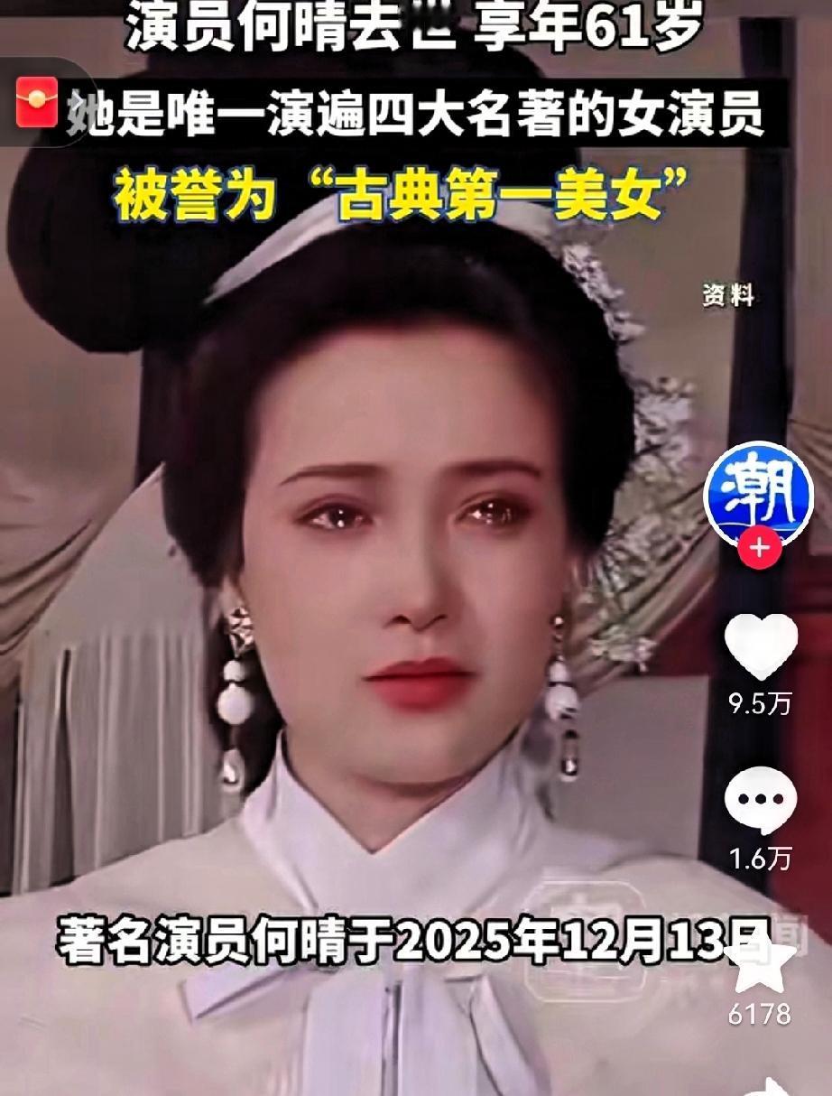 痛惜!61岁何晴离世,她是演遍四大名著的古典美人 12月13日,演员何晴永远离开了我们,享年61岁。 她是唯一演遍四大名著的女演员:《红楼梦》里的秦可卿、《西游记》中的怜怜、《水浒传》的李师师、《三国演义》的小乔,每个角色都成了经典。 有着“古典第一美女”之称的她,用灵动的表演,把古典女子的温婉与韵味演绎得淋漓尽致,成为一代人的荧屏记忆。 从此世间再无这般灵动的古典美人,愿何晴老师一路走好🙏