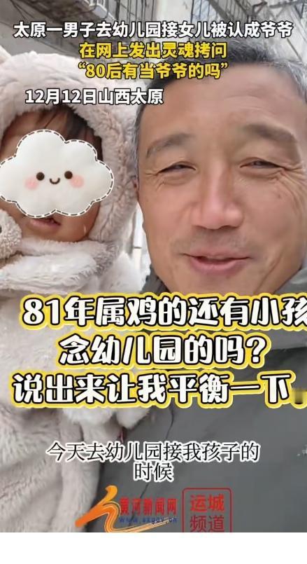 太真实了!山西太原一男子去幼儿园接女儿被女儿的同学误认为爷爷,关键是女儿的同学,说的很真诚,在他们看来,男子是爷爷辈的。 事后,男子忍不住在网上发视频灵魂拷问,80后有当爷爷的吗?我是81年的,属鸡的,很老吗?请问一下,81年属鸡的还有孩子在上幼儿园吗?说出来让我平衡一下。 有网友调侃道,80后可能有当爷爷的,但80后长的像你这么老的很罕见。 81年的都44周岁了,怎么可能没有人当爷爷的呢?有些早婚早育的人,别说44周岁当爷爷了,甚至三十七八岁就有当爷爷的。 44岁虽然很年轻,但是,44岁女儿才上幼儿园,说实话你这确实属于特别晚结婚生子的了。一般来说这个年龄阶段的人,孩子不说上高中,也都已经上初中了! 在我看来,年纪大真的不是问题 晚婚晚育也不是问题,只要日子过得好,家庭幸福,心态好,这些都不是什么问题。 大家觉得呢?欢迎大家评论区讨论留言。