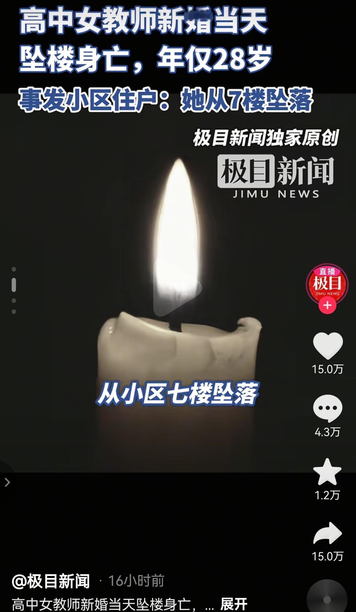 太悲催了!河南平顶山鲁山县一位28岁女高中历史教师,在新婚当天从小区7楼坠楼身亡,新婚本是人生的大事,也是人生最重要的时刻之一,为什么会选择在新婚当天坠楼身亡呢? 据网上流传的女教师朋友圈,可以看出,这位女生是一位不婚主义者,为了逃避结婚,她曾跟父母吵过、闹过、发疯过、甚至兵戎相见。 女生和父母对抗了11年,从大学毕业开始,已经整整对抗了7年,再加上大学的四年,就是11年。 更过分的是,父母为了让女儿结婚,不惜以命相逼,女生看反抗不了,只好乖乖听话,选择相亲结果。 令人无语的是,父母逼孩子结婚就算了,因为,这是人家的家事可是,有些亲戚怎么好意思站在道德最高点,指责女生不孝顺呢?而且,在女生看来,她对她的对象并不满意,只会惹她生气,女生跟父母讲,父母只会一味地让她逆来顺受。 这一系列的事情,成为压死骆驼的最后一根稻草,女生竟然在新婚当天从7楼跳了下来,真的不敢想象?她当时有多崩溃?有多绝望? 你要知道,她要文化有文化,要学历有学历,要工作有工作。她是一位在编老师,工作稳定,不说工资有多少吧?最起码超过了很多人。 这下好了吧?催婚却成为了女生的一道催命符,真的是一场人间悲剧。 如果当时父母别这么强硬,让她自己选择自己的人生,何至于发生这种悲剧呢? 希望通过这件事情,也给所有催婚的父母一个警示,在催孩子结婚这件事情上,别催的太紧,催的太紧,只会适得其反,甚至发生类似的悲剧!真的要警钟长鸣啊! 大家觉得呢?欢迎大家评论区讨论留言。