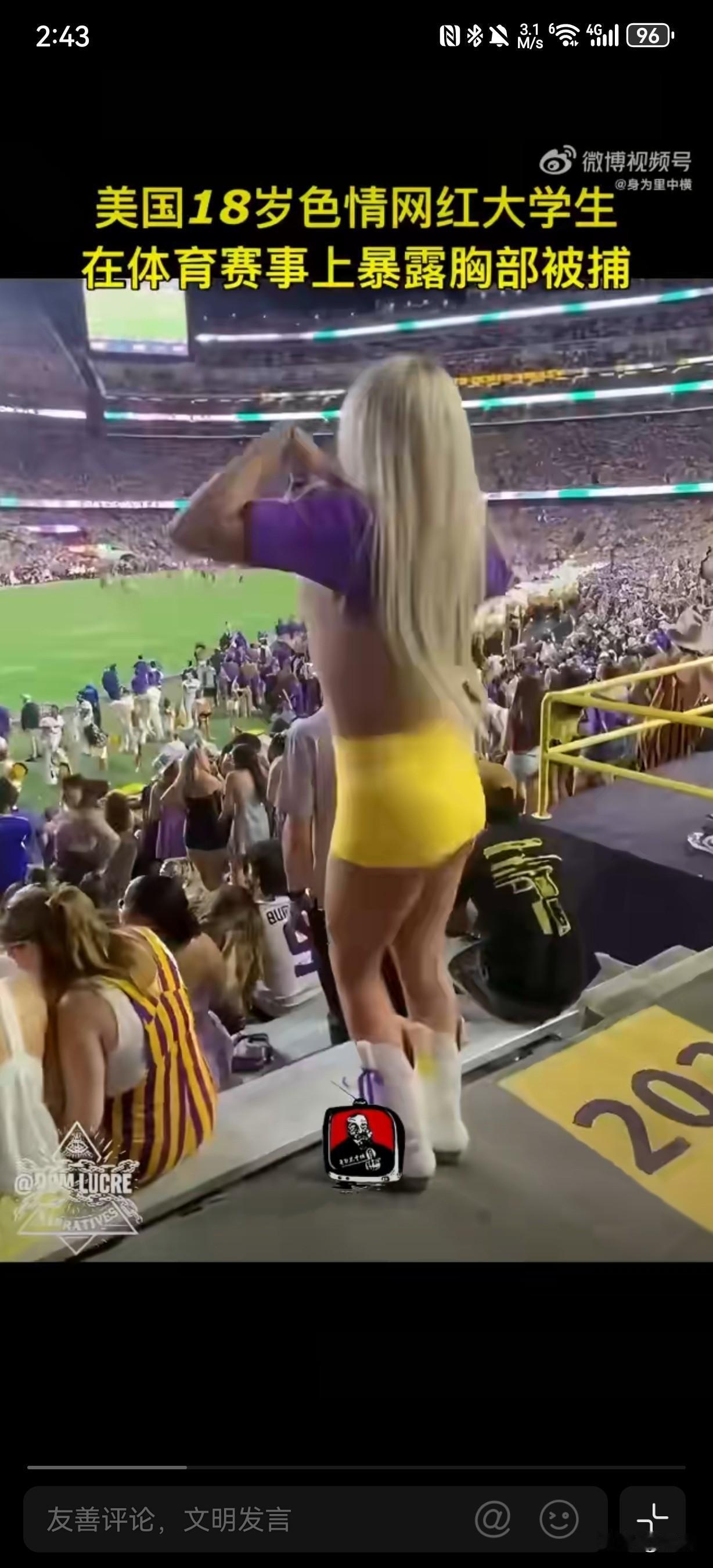 路易斯安那州立大学(LSU)18岁新生阿比盖尔·卢茨(Abigail Lutz)在本校老虎队主场赛事期间故意抬衣暴露胸部,试图吸引观众关注以推广其OnlyFans账号,当场被安保及警方控制带离。阿比盖尔身为社交媒体红人,Instagram粉丝超30万,同时也是OnlyFans内容创作者,事发时不仅笑着对警方说“逮捕我吧,爸爸”,后续还在社交平台调侃“谁来保释我?”,态度轻佻。 目前她因涉嫌公共猥亵和扰乱秩序被控制,暂无正式起诉记录,大概率拘留后已释放,但此类行为通常会导致终身禁止进入该球场。阿比盖尔事后仍活跃于社交平台,直言“我觉得我是最大的老虎队粉丝”“我爱这个趋势”,毫无悔意,还被外界比作同校网红莉维·邓恩(Livvy Dunne)。