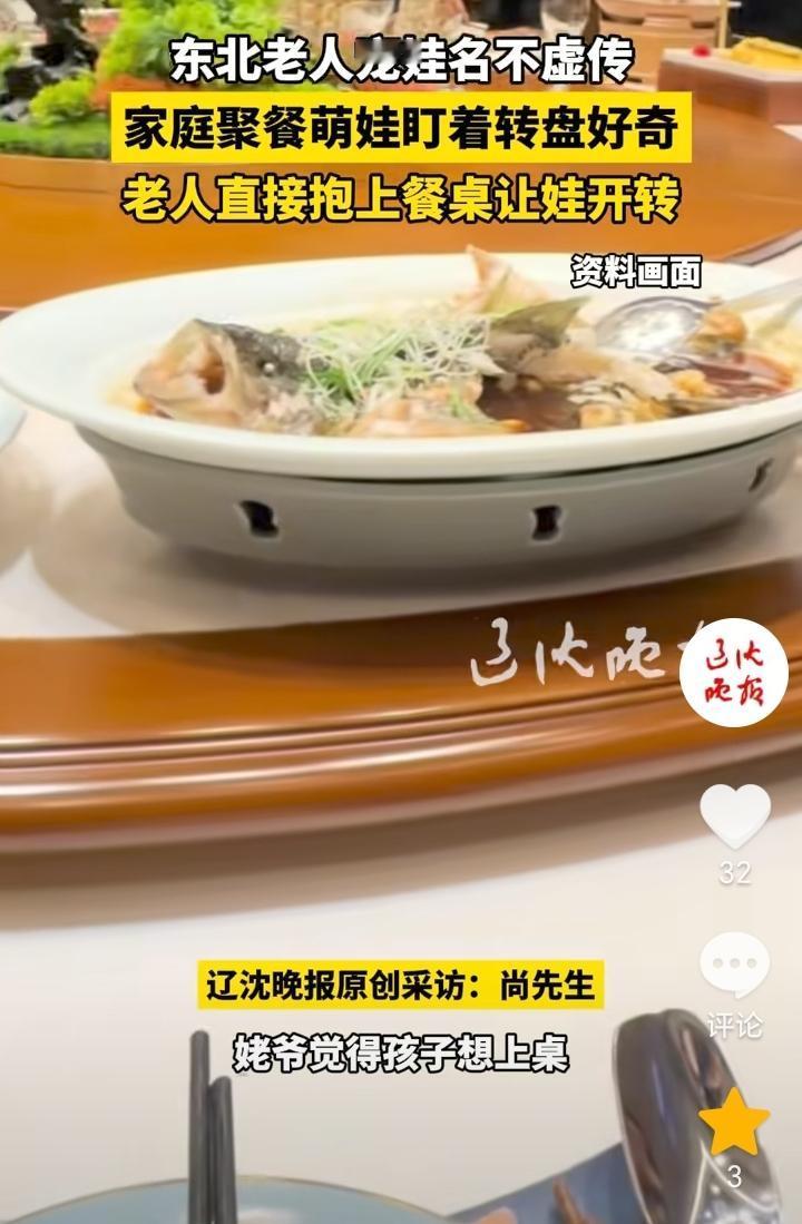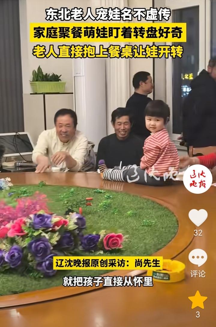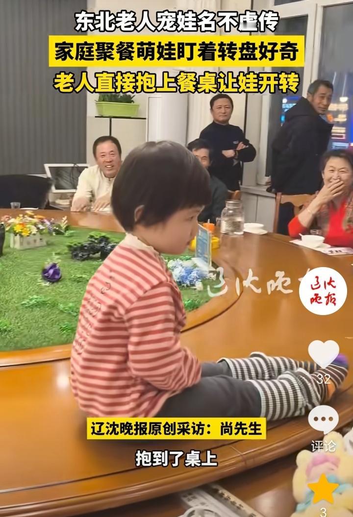 过度宠爱就是溺爱!辽宁,家庭聚餐萌娃盯着餐桌转盘好奇,姥爷看出了萌娃的心思直接把萌娃从怀里抱到了桌子上,也让她转了起来。 视频来源《辽沈晚报》 这姥爷对孩子也是太宠爱了,孩子好奇桌子上的转盘,姥爷就立马满足孩子的好奇,直接把孩子抱上桌子转了起来。 姥爷宠爱孩子可以理解,但是有时候不能过于宠爱,因为那样就会变成溺爱,桌子上是放菜吃饭的地方,结果直接把孩子放上去,更何况桌子还坐满了人,我个人觉得这样不太好,容易让孩子养成一个坏习惯。