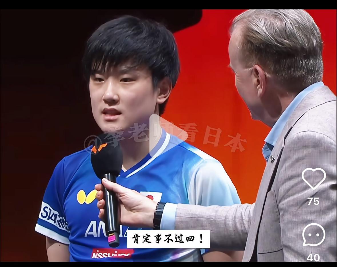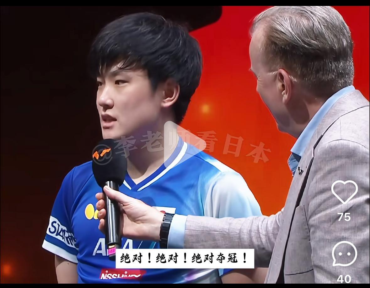 张本智和战胜林诗栋三次高喊“绝对夺冠🏆” 张本智和在场内采访中表示: “确实
