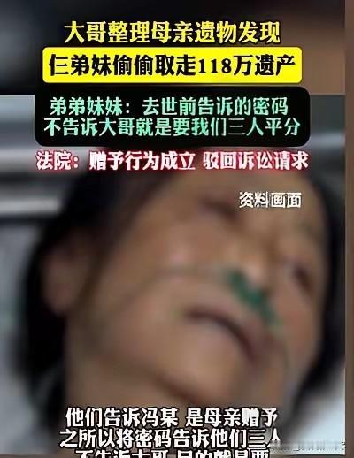 青海西宁,一男子照顾母亲多年,母亲去世后,男子发现其118万银行卡不翼而飞。不曾想,弟妹三人拿走银行卡,并一口咬定:母亲生前把银行卡和密码告诉他们,就是赠予他们,母亲说大哥条件好,故把他排除在外。男子不干了,将弟妹三人告上法庭。法院的判决让人意外。 青海西宁的冯先生捧着母亲的死亡证明,指尖微微发颤。母亲去世后的第七天,他整理遗物时发现那张存有118万养老钱的银行卡不见了,翻遍了衣柜抽屉、书架夹层,甚至床底的旧箱子,都没找到丝毫踪迹。一番追问下,弟弟妹妹三人的回应,让他如遭雷击。 弟妹三人坦然承认是他们拿走了银行卡,还说这是母亲生前的意愿。他们声称母亲在世时,就把银行卡和取款密码一起告诉了他们,明确表示这笔钱要留给三个弟妹平分, 之所以排除大哥冯先生,是因为母亲觉得他经济条件好,不需要这笔养老钱的补贴。这样的说法让冯先生无法接受,他照顾母亲十几年,怎么也不信母亲会做出这样的决定。 冯先生的母亲晚年患上慢性病,行动逐渐不便,从2012年开始,他就把母亲接到自己家里照顾。 每天清晨起床先给母亲测血压、煮早饭,中午变着花样做软烂易消化的饭菜,晚上帮母亲擦身、按摩,十几年如一日从未间断。 母亲住院的日子里,也是他守在病床前端屎端尿、日夜陪护,弟妹三人只是偶尔来医院探望,留下一些营养品就匆匆离开,从未承担过实际的照料责任。 那些年,冯先生不仅付出了时间和精力,还承担了母亲所有的医疗费用和生活开支。他自己经营着一家小建材店,收入虽不算顶尖,但足够支撑家庭开销,可这并不代表他就该被排除在母亲的财产分配之外。 在他看来,这笔118万的存款是母亲的遗产,按照法律规定,四个子女都有继承权,而自己尽了主要赡养义务,理应多分,绝非被完全剥夺资格。 多次和弟妹协商无果后,冯先生一纸诉状将三人告上了法庭,请求法院判定弟妹返还属于自己的遗产份额。庭审现场,双方争执不下,冯先生提交了社区开具的赡养证明、医院的缴费单据、邻居的证人证言等一系列证据,证明自己多年来对母亲的照料和付出。 而弟妹三人则坚持母亲的赠与是真实意愿,还提到母亲生前有过将定期存单交付并告知密码的习惯,之前也曾给过他们小额存款,都是用同样的方式完成赠与。 法院审理期间,调取了银行的取款记录,发现弟妹三人在母亲去世后一周内,分三次将118万存款全部取出,转入了各自的账户。 同时,通过核实母亲生前的银行交易记录和相关证人证言,确认母亲确实有过以“交付存单+告知密码”完成赠与的惯例,且冯先生确实从未知晓该银行卡的密码及具体存款数额。 结合《民法典》中关于赠与行为的认定标准,法院认为,赠与人需具备完全民事行为能力,意思表示真实且明确,动产交付后赠与行为即成立。 冯先生的母亲作为完全民事行为能力人,将银行卡及密码交付给弟妹三人,已完成财产转移的核心要件,因此认定赠与行为有效。最终,法院驳回了冯先生的诉讼请求,判决118万存款归弟妹三人所有。 这个判决结果让冯先生始料未及,他怎么也想不通,自己十几年的悉心照料,竟比不上一张银行卡和一串密码。 他始终觉得,母亲或许是在弟妹的劝说下一时糊涂,并非真正想剥夺自己的继承权。可法律讲究证据,母亲没有留下书面遗嘱,而弟妹三人提供的线索和法院核实的惯例,形成了完整的证据链。 一场围绕118万存款的家庭纠纷,最终以法律的裁决落下帷幕,却也让原本和睦的兄弟姐妹彻底反目。 赡养父母是子女的法定义务,而财产分配则关乎老人的真实意愿,这场纠纷背后,藏着亲情与利益的博弈,也引发了人们对遗产继承与赡养义务的深思。 对此,你们有什么看法,欢迎评论留言~