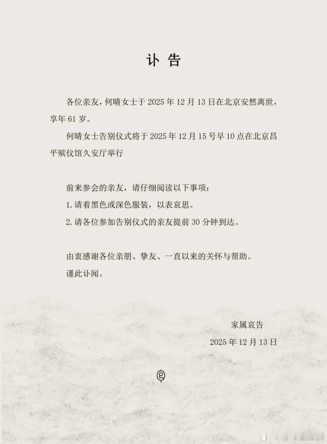 演員何晴去世 是唯一演遍四大名著女演員.12月13日,一份家屬發布的訃告顯示,著名演員何晴在北京安然離世,享年61歲。告別儀式將於2025年12月15日早10點在北京昌平殯儀館久安廳舉行。何晴是中國影視史上極具標誌性的女演員,也是迄今為止唯一一位在四大古典名著改編電視劇中均有重要角色出演的女性藝人,被譽為「四大名著大滿貫第一人」。1984年,她在《西遊記》中飾演文殊菩薩化身的憐憐;1988年,在電影《紅樓夢》裏塑造了多情不幸的秦可卿;1993年,《三國演義》中溫婉美艷的小喬成為其經典形象;1996年,她又在《水滸傳》中演繹出李師師的端莊典雅。何晴1964年1月13日出生於浙江衢州江山市,畢業於浙江崑劇團,1983年憑藉《少林俗家弟子》正式踏入演藝道路。除四大名著外,何晴的藝術成就亦涵蓋多元題材。1992年,她作為內地首批「瑤女郎」出演《青青河邊草》的華又琳,塑造出獨立知性的新時代女性形象;1998年在《澳門的故事》中突破古典戲路,飾演潑辣豪爽的中葡混血兒歐迪絲;2011年,她在《大宅門1912》中接棒飾演楊九紅,與陳寶國搭檔演繹亂世愛情;2016年,她又在《女醫明妃傳》中首次挑戰反派,將孫太后的狠絕與溫婉演繹得淋漓盡致。從崑曲舞台到影視熒幕,何晴以扎實的演技和獨特的古典氣質,塑造了數十個鮮活的角色。她的表演真切樸實,亦古亦今的塑造能力,讓眾多形象成為觀眾心中難以復刻的經典。演员何晴去世