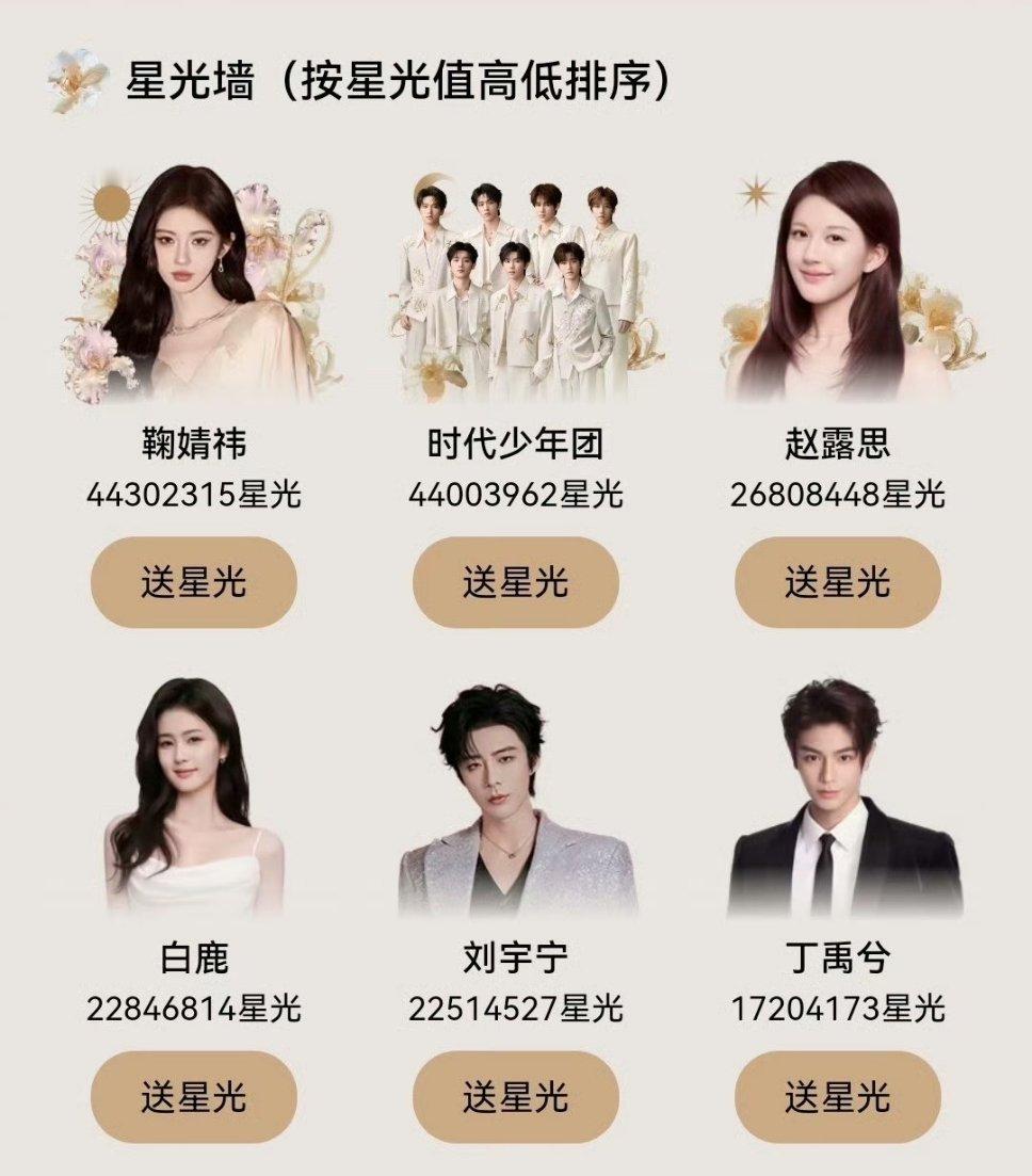 星光大赏投票去水星光大赏各家都要求去水🐧也说要去水去完水排名会有变化吗? 现在前六排名是鞠婧祎 时代少年团 赵露思白鹿 刘宇宁 丁禹兮