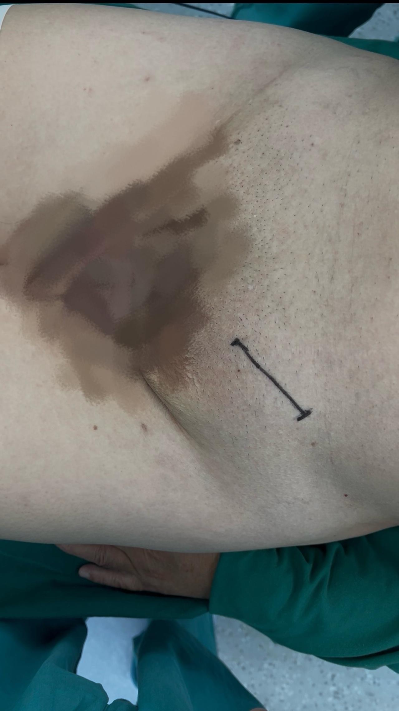 巨大的腹股沟疝,肠子掉出来了,清醒状态下,无法回纳。全麻以后,患者肌肉松弛了,被我推回去了,做手术修补腹沟疝手术