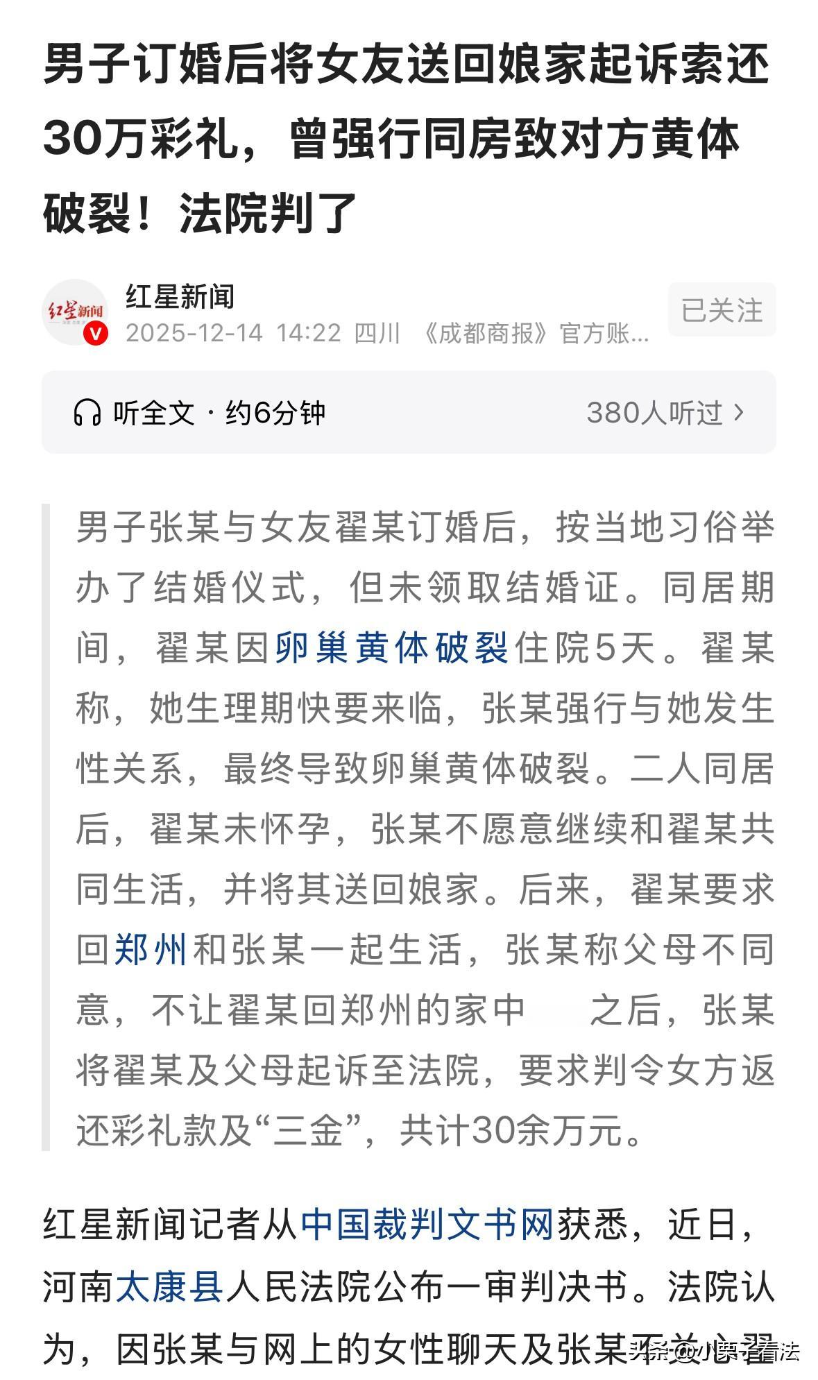 河南太康,女子和男友办完婚礼后同居,同居后女子发现男友在网上和别的女人聊天,还强迫女子同房,导致女子黄体酮破裂住院5天。出院半个月后,男友以女子没有怀孕为由,将女子送回老家。女子要求回到来继续同居,男友称父母不同意拒绝了女子要求,并起诉女子归还30万元彩礼。女子拿出同居时签订的财产协议,约定好男友不得以任何理由要回彩礼,法院是这样判决的。 翟某担心张某会对不起她,双方就签订了财产协议,张某表示不会以任何理由索要彩礼,但事实却完全相反,让翟某欲哭无泪。 在2024年4月29日,翟某和张某携手走进人生的下一个阶段,订婚纳聘,两个人即将走进婚姻的殿堂,共同组建一个小家。 订完婚后,双方家庭就着手准备婚礼事宜。经过8个多月的筹备,翟某和张某终于在2025年1月25日举办了婚礼,但是并没有领证。 按照当地习俗,举办了婚礼就是夫妻,而且双方家庭也互相过了彩礼和嫁妆,哪怕没有一纸婚约,但在所有人的眼里,翟某和张某就已经是夫妻了。 既然是夫妻,自然要居住在一起。但是婚后的生活却没有翟某想象的那么美好,翟某发现张某不仅对她关心少了,还在网上和小姑娘聊天,多次被翟某发现。 虽然翟某没有发现实质性的证据证明张某做了对不起翟某的事,但还是以此为由和张某好好探讨了一番,要是张某做出对不起翟某的事,该怎么处理? 张某很大方的表示,要是自己做出对不起翟某的事,就把所有东西包括房子,都给翟某。 翟某觉得口说无凭,张某还答应签订婚前婚内财产协议,双方达成共识,约定如下: 张某在某小区的房屋归翟某所有,包括房屋婚前婚内首付部分、还贷部分和增值部分等所有权益,都归翟某所有。 双方婚前,张某以及张某父母给付翟某及翟某父母的彩礼金、金银首饰等彩礼性质的财产都归翟某所有,张某不得以任何理由要回。 协议签好后,翟某放心了很多,继续好好和张某过日子。但是张某却做出一件让翟某无法原谅的事情,就是在翟某生理期前强行同房,导致翟某黄体酮破裂。 翟某身体上的创伤让翟某住院5天,花费1万多元。但是更加让翟某难过的是,从出院后到6月末,张某一句道歉都没有,反而还将翟某送回了娘家。 张某声称,因同居后翟某一直没有怀孕,所以父母不同意两个人继续住在一起,所以就把翟某送回了娘家。 这样的理由在翟某娘家传得沸沸扬扬,人言可畏,翟某无法在娘家继续生活,要求回到张某身边,要和张某继续同居,但是却被张某拒绝了,理由是张某父母不同意。 心灰意冷的翟某还不知道该怎样处理和张某的关系,张某就已经做出抉择,将翟某以及翟某父母告上法庭,要求返还30多万元彩礼。 张某将30万彩礼的明细一一列举出来: 订婚当天,张某给彩礼20万元、金猪2000元,翟某回礼2000元。张某“看小件”时给礼钱2万元,端茶钱4000元、价值18572.01元三金。 婚礼当天,上下车礼2万元,另外还给有改口费、拜礼钱4.5万元,共计给付翟家307572.01元。 根据《最高法关于适用〈民法典〉婚姻家庭编的解释(一)》第5条的规定:当事人请求返还按照习俗给付的彩礼的,如果查明属于以下情形,人民法院应当予以支持: (一)双方未办理结婚登记手续; (二)双方办理结婚登记手续但确未共同生活; (三)婚前给付并导致给付人生活困难。 适用前款第二项、第三项的规定,应当以双方离婚为条件。 张某要求翟某家返还彩礼的诉求,因双方并未领取结婚登记证书,所以张某的诉求符合返还彩礼的要求,法院予以支持。 但是针对张某所述的彩礼金额,法院却有不同看法: 张某主张的改口费和拜礼钱4.5万元,因张某提供的证人只有张某的亲叔叔单方面证词,双方存在利害关系,因此改口费和拜礼钱要求返还,法院不予支持。 张某在同居期间和其他小姑娘在网上聊天,还在翟某不情愿的情况下,强行与翟某同房并导致翟某身体收到伤害,张某存在过错。 翟某住院期间治疗花费12509.68元,同居时给张某买手机话费6099元,都应该从彩礼中扣除。 结合张某在同居中的过错程度,以及翟某花费彩礼的情况和翟某家给付嫁妆的情况,法院最终判决: 翟某和家人返还彩礼136000元以及三金或者三金的折价款18572.01元。 张某返还翟家嫁妆:三轮车一台,洗衣机、电视、冰箱各一台,3套四件套,12条被子,一对枕头,真皮沙发一套、电视柜一个、茶几一个、化妆台及凳子各一个等等。 给得起高额彩礼的,往往伴随着其他的要求。一旦没有达成目标,就会撤回给出的彩礼,最终受伤的都是女方和女方的家庭。