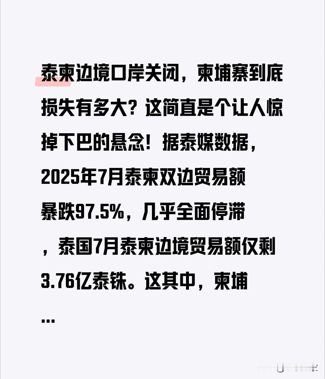 泰柬边境口岸关闭,柬埔寨到底损失有多大?这简直是个让人惊掉下巴的悬念!据泰媒数据,2025年7月泰柬双边贸易额暴跌97.5%,几乎全面停滞,泰国7月泰柬边境贸易额仅剩3.76亿泰铢。这其中,柬埔寨的出口和进口也大幅下降,出口仅3.7亿泰铢(降幅97%),进口更仅剩600万泰铢(降幅99.8%)。而且边境冲突还导致至少25人死亡、50万人流离失所。 这样的损失对柬埔寨经济和民生的打击难以估量。大家觉得柬埔寨要多久才能恢复元气?这场冲突会如何发展?泰柬边境口岸何时能重新开放? 柬埔寨 泰国柬埔寨局势 柬埔寨关系 泰柬边境局势 泰柬边境争端 柬埔寨 泰国柬埔寨局势 柬埔寨关系 泰柬边境局势 泰国柬埔寨关系 柬埔寨新规 泰国柬埔寨停战