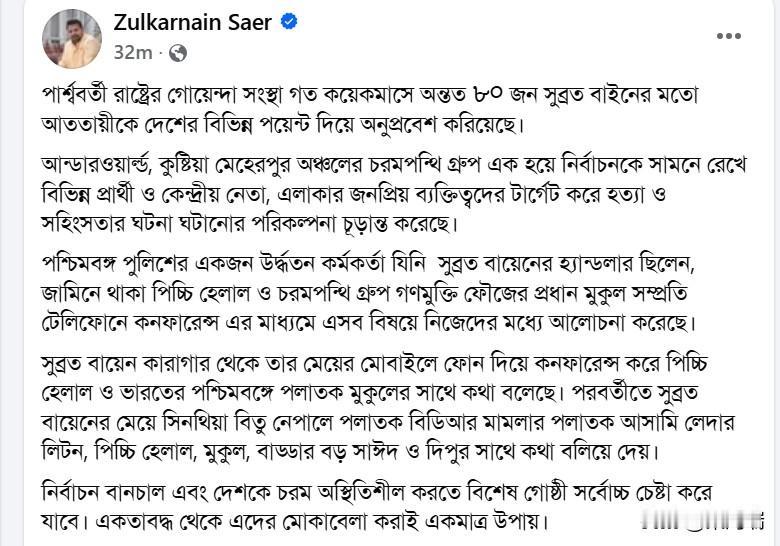 12月12日,在孟加拉国达卡发生一起枪击案,受害者是激进伊斯兰组织“Inkilab Cultural Centre”的发言人奥斯曼·哈迪(Osman Hadi)。 沙里夫·奥斯曼·哈迪 (Sharif Osman Hadi),独立议会候选人,以及“Inquilab Mancha”的发言人。 事发时间:2025年12月12日下午2点25分左右。 事发地点:达卡市 Bijoynagar 地区的 DR Tower 前。 案情细节:监控录像显示,两名骑摩托车的袭击者向当时乘坐电动三轮车的哈迪开枪,击中其头部,随后逃离现场。 受害者现状:哈迪被紧急送往医院,情况危急,目前仍在接受治疗,子弹仍留在脑内。 袭击发生前几个小时,哈迪曾在社交媒体 Facebook 上发布了一张包含印度东北部地区(即“七姐妹”)的“大孟加拉国”地图,引发争议。孟加拉国政府和其他政党强烈谴责了这次袭击,但一些印度方面的社交媒体账户却对此表示“庆祝”。 在过去的几个月里,印度情报机构R&W通过孟加拉国境内的各个地点,至少向该国渗透了80名像苏布拉塔·拜恩一样的刺客。 今天,两名身份不明的枪手枪击了革命论坛发言人沙里夫·乌斯曼·哈迪。